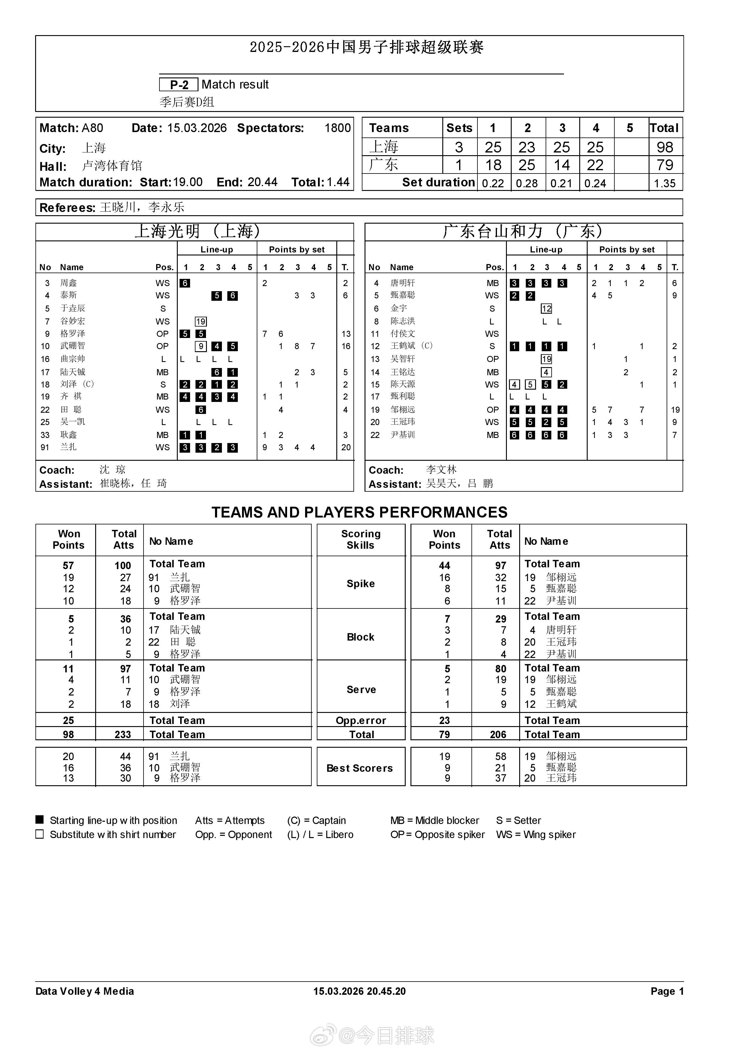 【中国男排超级联赛 上海3-1广东】15日晚,A级季后赛总第20轮,D组的上海男排在主场3-1(25-18, 23-25, 25-14, 25-22)力克广东,6战6胜全取18分晋级四强。兰扎20分本场最高,邹栩远19分。