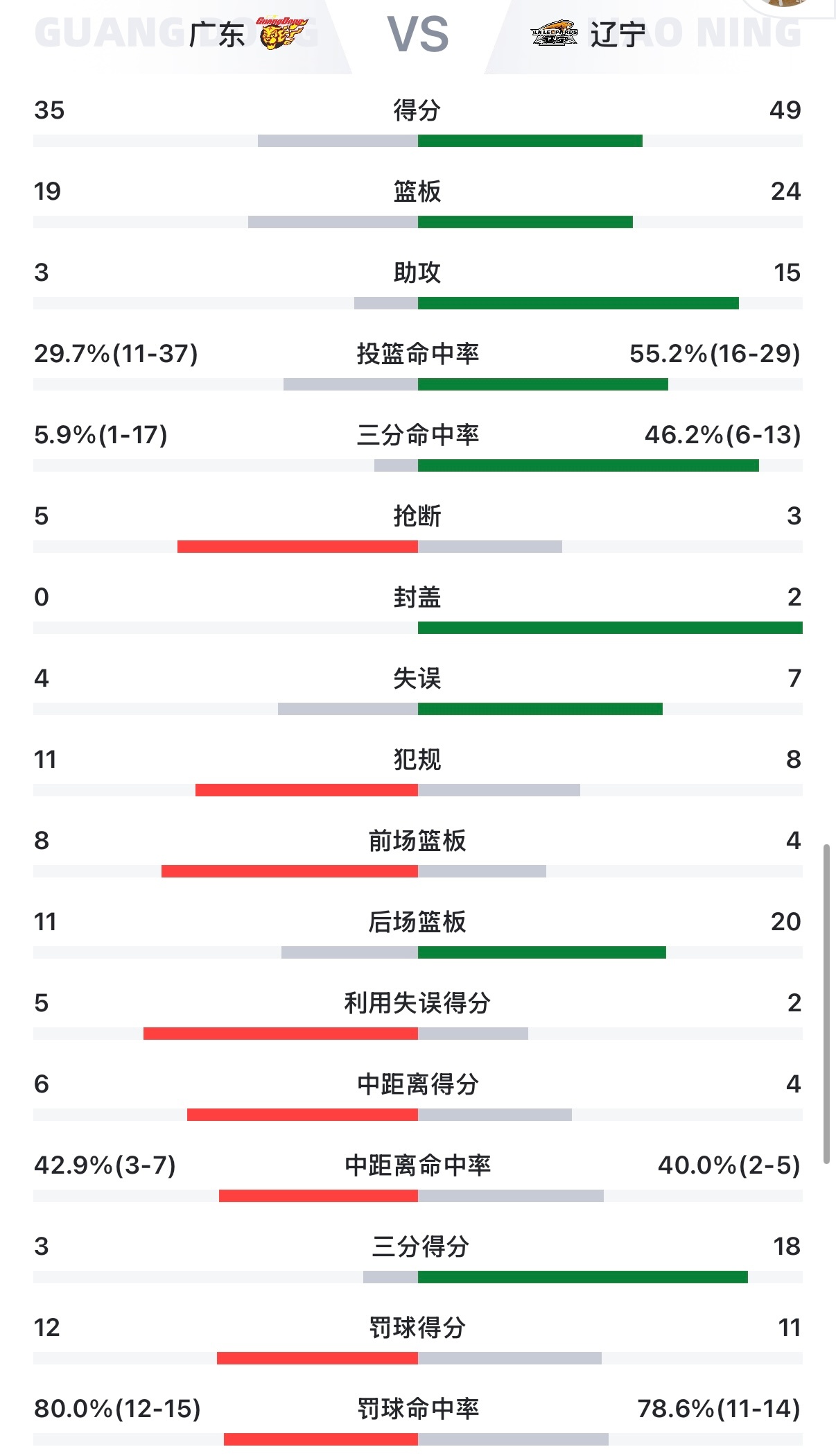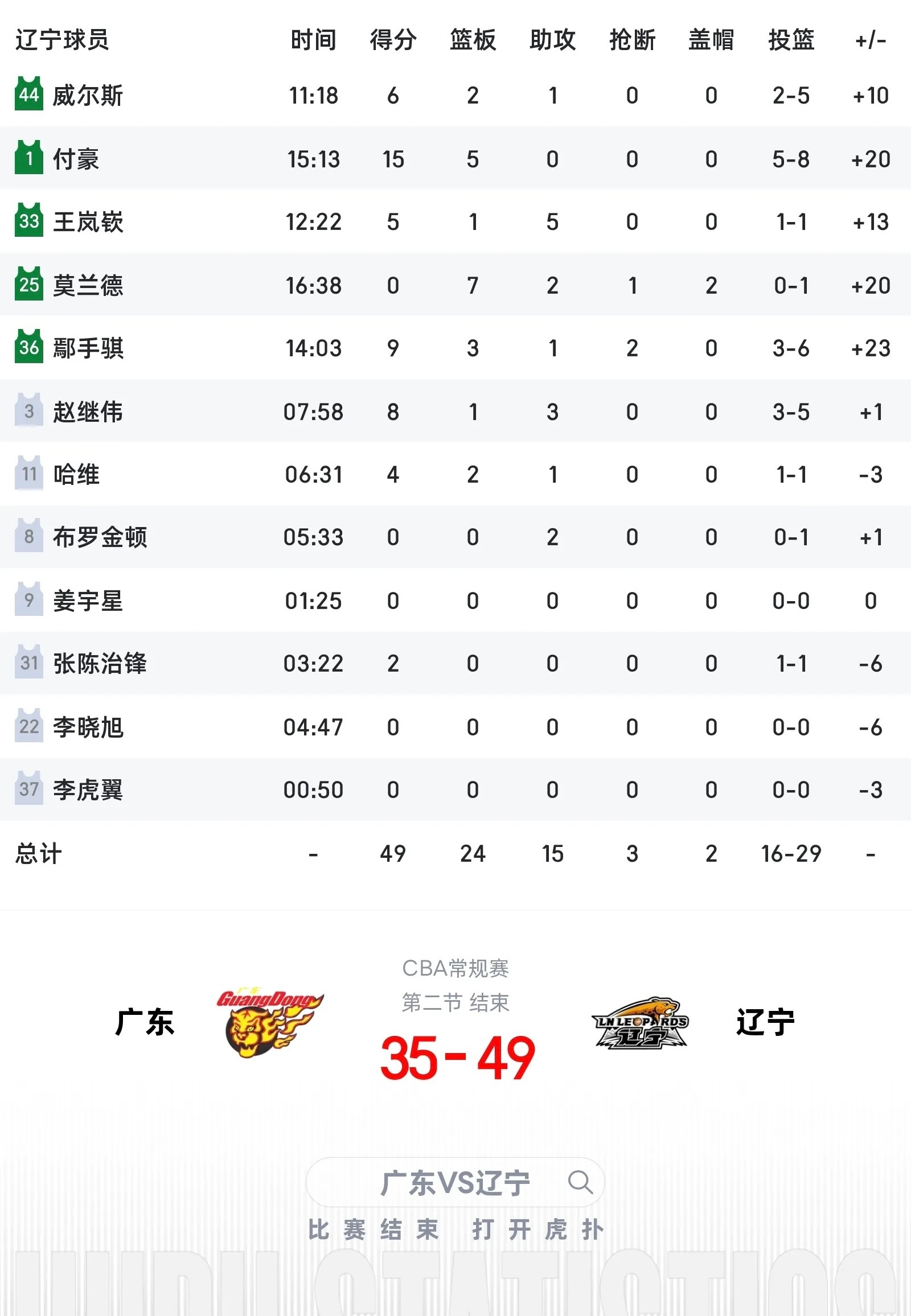广东男篮vs辽宁男篮 半场比分,辽宁男篮49-35广东男篮。付豪15分5篮板,鄢