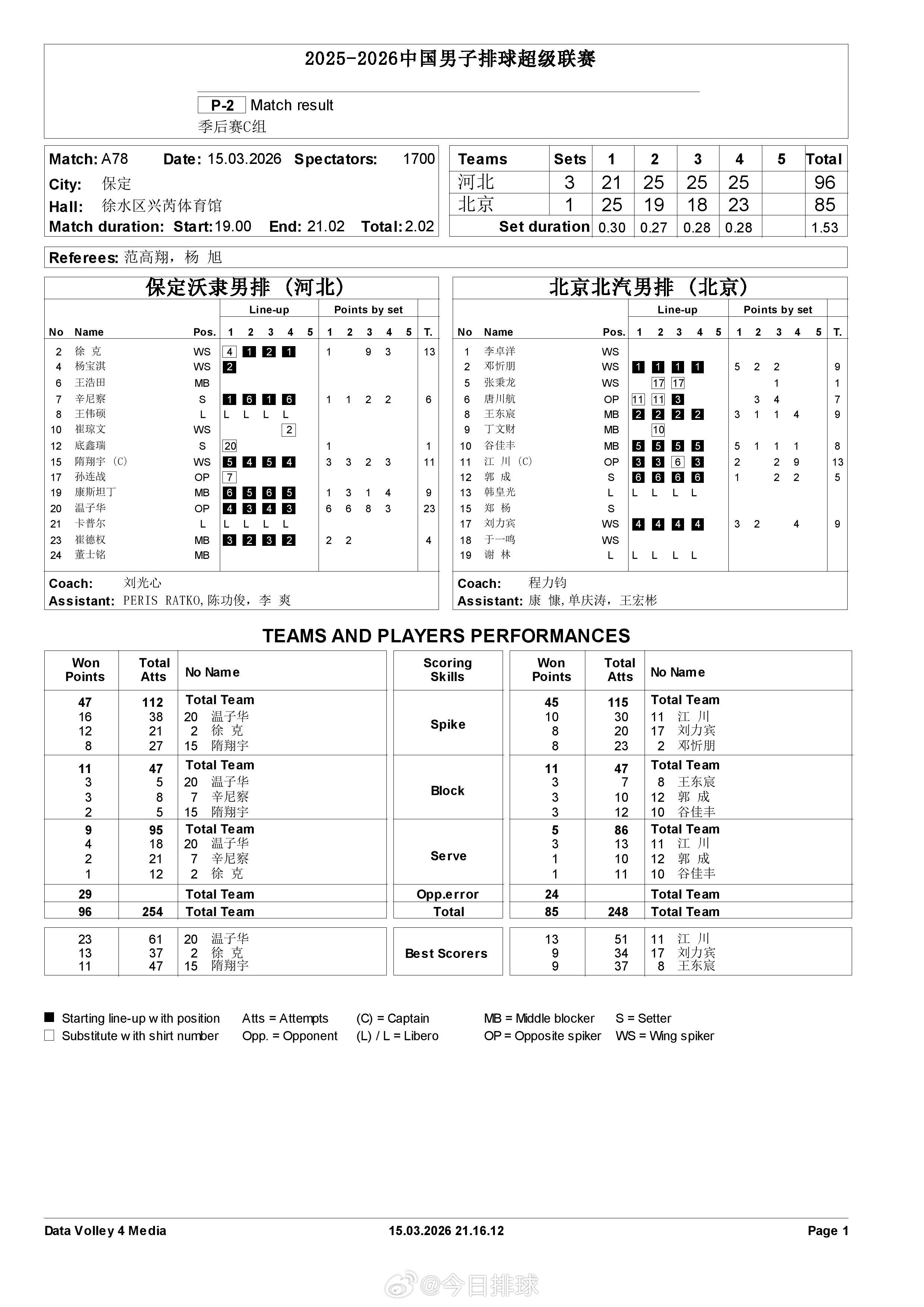【中国男排超级联赛 保定3-1北京】15日晚,A级季后赛总第20轮,C组的保定沃隶在主场以3-1(21-25, 25-17, 25-18, 25-23)逆转北京北汽晋级四强。温子华23分本场最高。