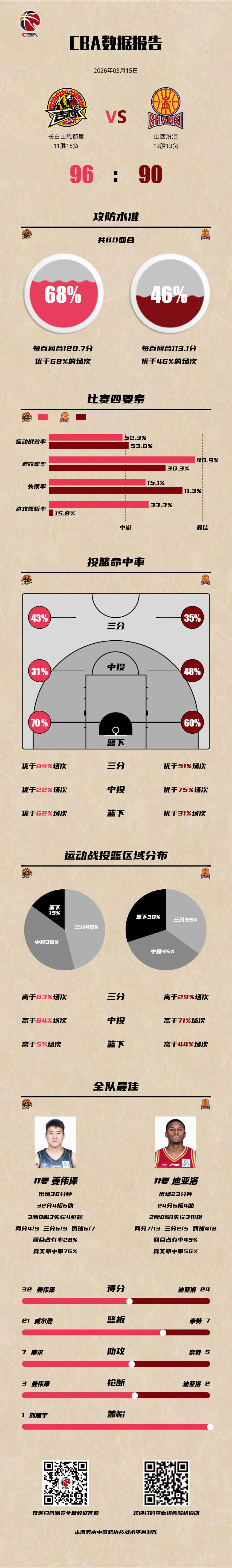 长白山恩都里 96-90 山西汾酒 吉林男篮vs山西男篮 长白山恩都里:姜伟泽32分4篮板6助攻3抢断,威尔逊27分21篮板5助攻,栾利程16分4篮板; 山西汾酒:迪亚洛24分6篮板4助攻2抢断,张宁16分,贾明儒13分。以城之名
