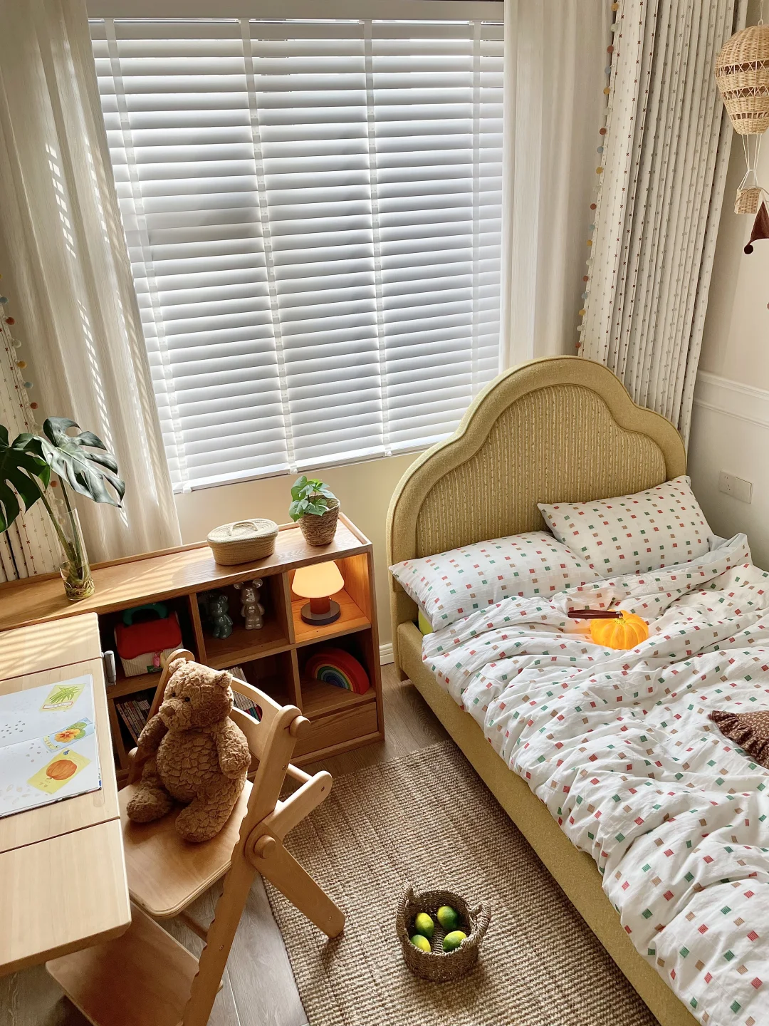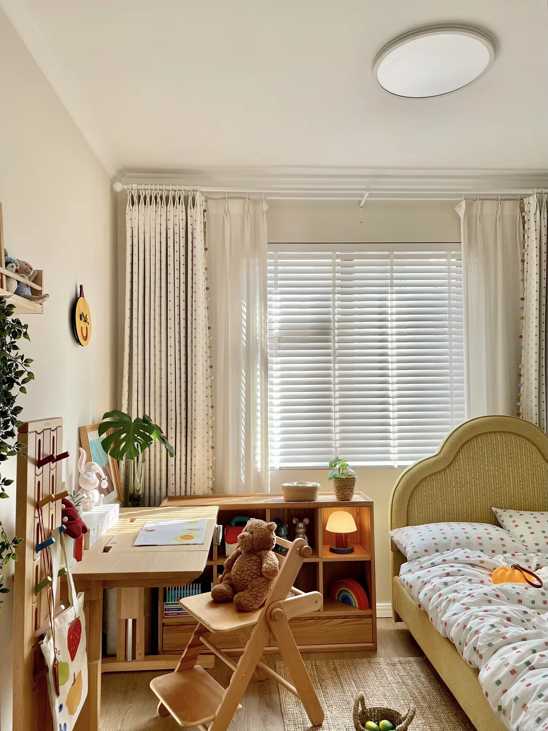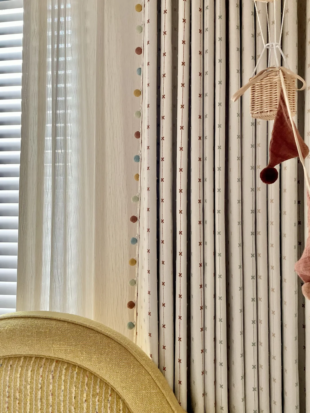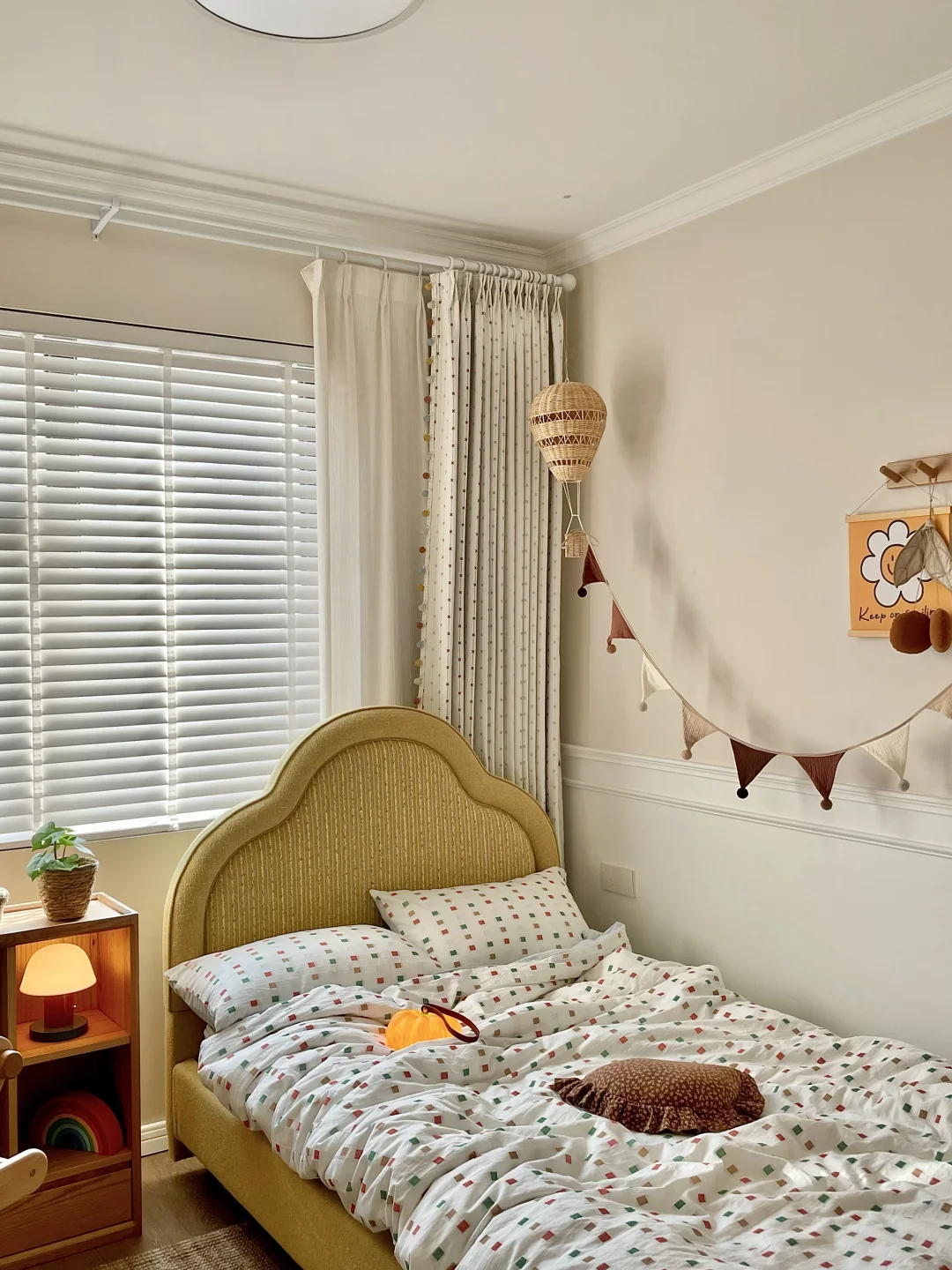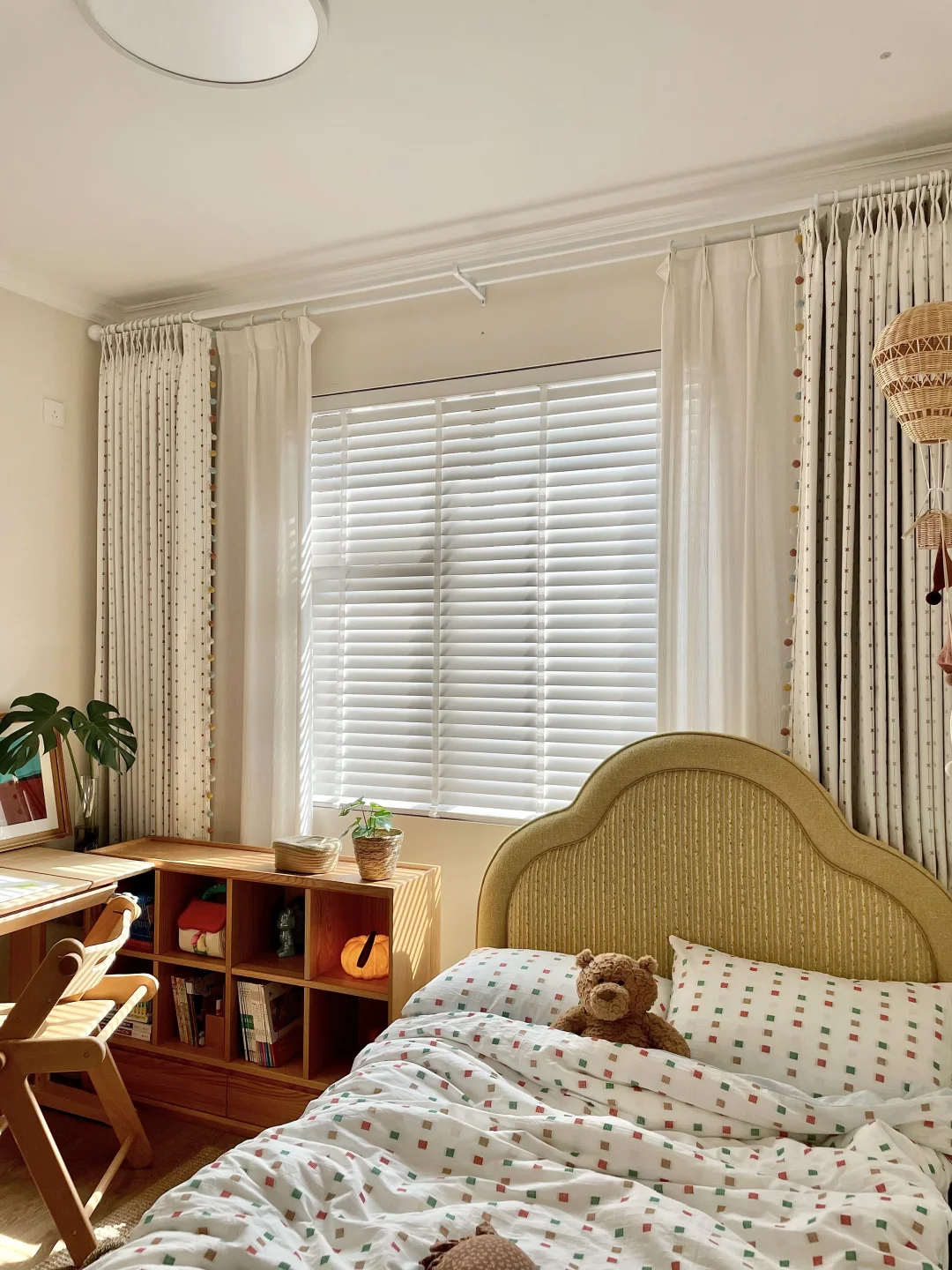 为女儿打造一间好住又童趣的小房间 真的太有成就感啦~ 暖乎乎的奶油色调+半包围布局,温馨又实用 房间里最满意的就是三千金这套布帘+纱帘+木百叶组合,颜值、质感、层次一步到位,越看越喜欢💕 ✨ 布帘·彩虹星愿🌟 低饱和度的奶油色雪尼尔面料 侧边的马卡龙绒球花边是点睛之笔! 布面上的彩色刺绣图案就像散落的流星一样可爱 加了遮光布效果更好,白天午休也可以睡个安稳懒觉😉童年就该这么五彩斑斓又治愈呀! ✨ 纱帘·扶风纱 亚麻质感的竖条纹,肌理感满满 偏爱它“透光不透人”的特性, 白天拉上就是自带的柔光滤镜 平时看书学习,光线也很柔和~ ✨ 木百叶:素雪白❄️ 温润的白色木片 阳光透过叶片洒进房间的斑驳光影 氛围感直接拉满,像闯进了秘密花园。 搭配彩虹星愿布帘,整个小空间童趣感满满~ 把彩虹和星光搬进女儿房,温柔又有童趣 这才是童年该有的样子呀 喜欢的姐妹可以直接抄作业啦✅