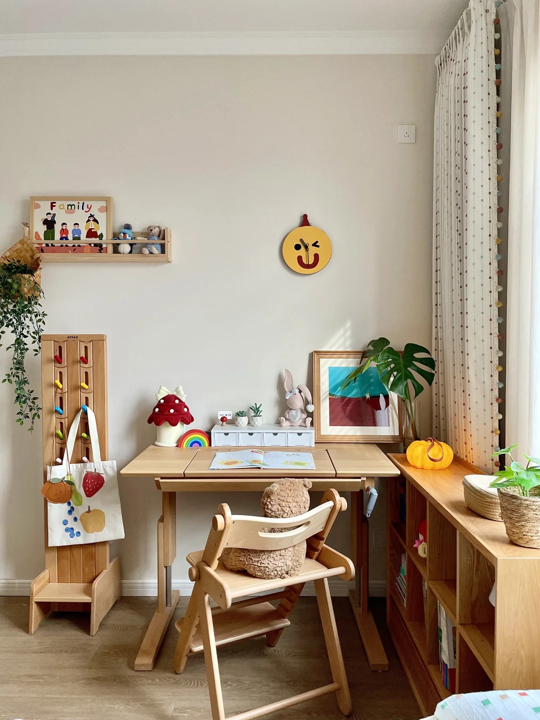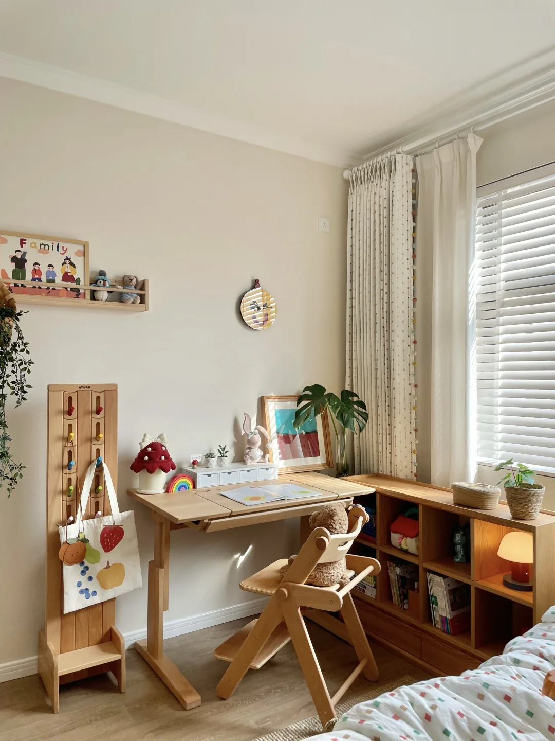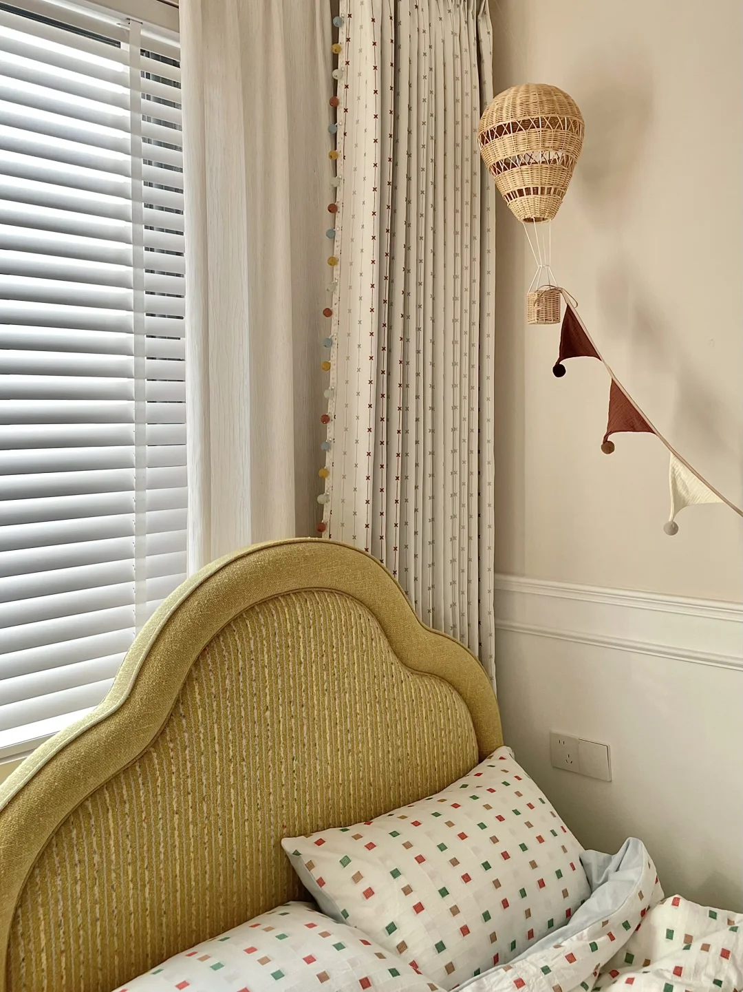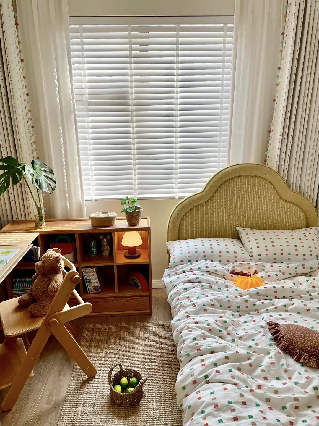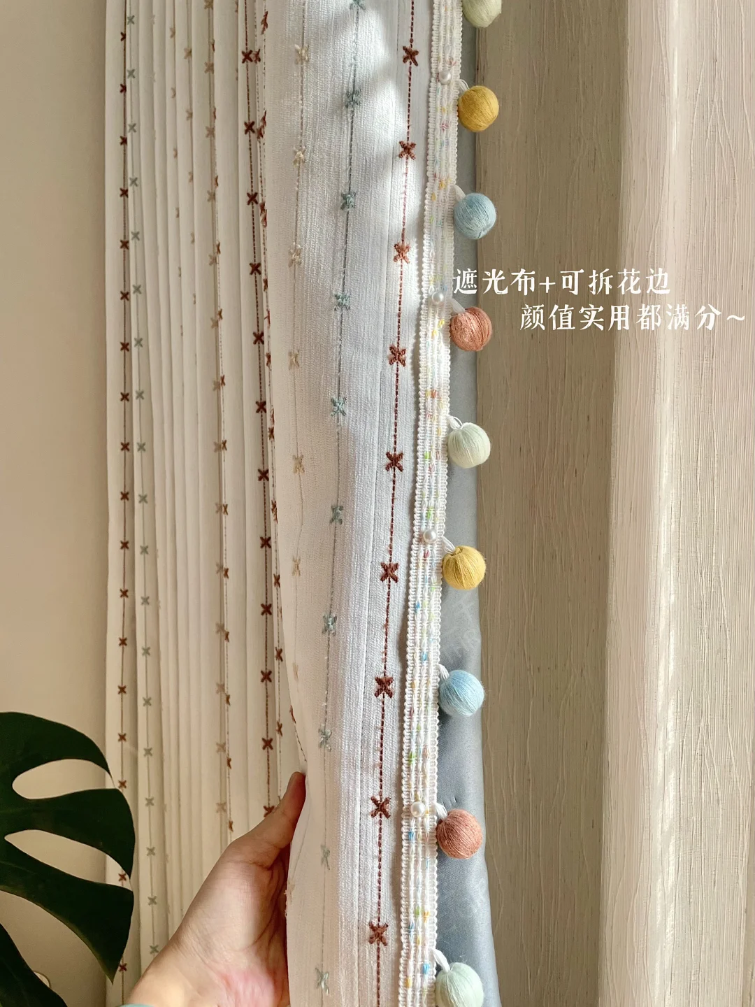 为女儿打造一间好住又童趣的小房间 真的太有成就感啦~ 暖乎乎的奶油色调+半包围布局,温馨又实用 房间里最满意的就是三千金这套布帘+纱帘+木百叶组合,颜值、质感、层次一步到位,越看越喜欢💕 ✨ 布帘·彩虹星愿🌟 低饱和度的奶油色雪尼尔面料 侧边的马卡龙绒球花边是点睛之笔! 布面上的彩色刺绣图案就像散落的流星一样可爱 加了遮光布效果更好,白天午休也可以睡个安稳懒觉😉童年就该这么五彩斑斓又治愈呀! ✨ 纱帘·扶风纱 亚麻质感的竖条纹,肌理感满满 偏爱它“透光不透人”的特性, 白天拉上就是自带的柔光滤镜 平时看书学习,光线也很柔和~ ✨ 木百叶:素雪白❄️ 温润的白色木片 阳光透过叶片洒进房间的斑驳光影 氛围感直接拉满,像闯进了秘密花园。 搭配彩虹星愿布帘,整个小空间童趣感满满~ 把彩虹和星光搬进女儿房,温柔又有童趣 这才是童年该有的样子呀 喜欢的姐妹可以直接抄作业啦✅