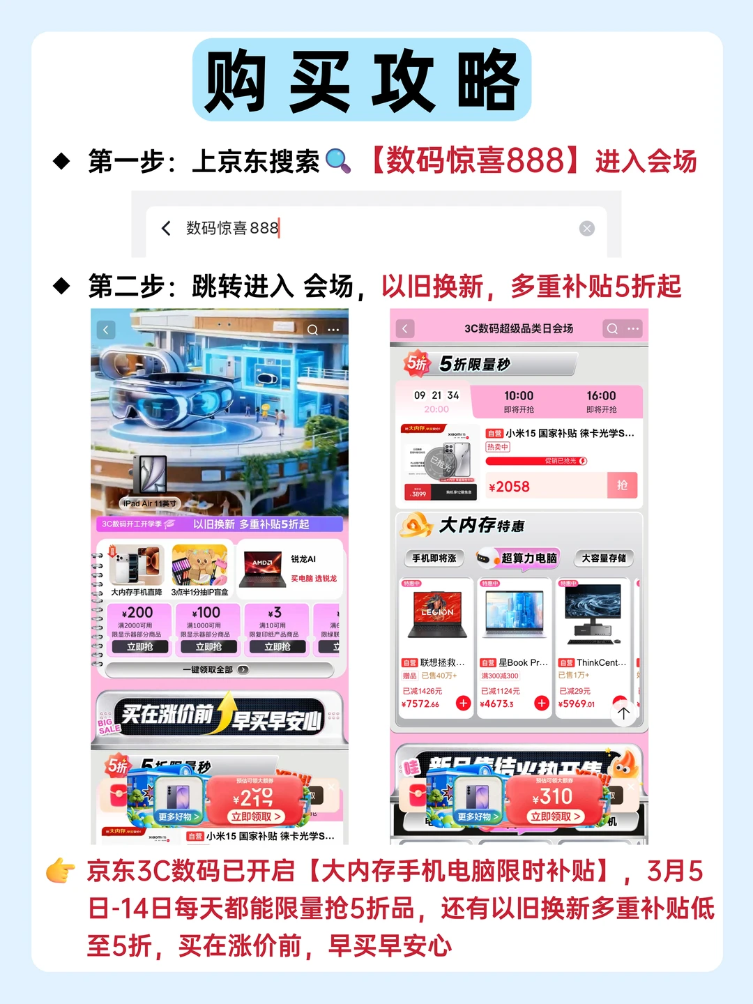 不过不要担心,现在京东搜【数码惊喜888】就能参与京东3C数码开启的【大内存手机电脑限时补贴】!3月5日-14日每天都能限量抢5折品,还有以旧换新多重补贴低至5折,买在涨价前,早买早安心