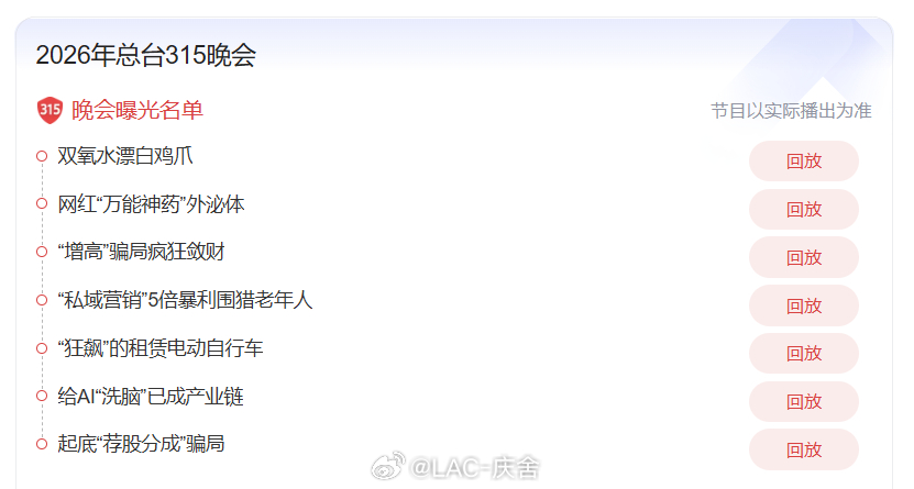 315名单 工业双氧水漂白凤爪;违规供危化添加剂。三无外泌体收割抗衰智商税;物理增高全是骗局。私域假专家洗脑营销;电动车违规解码、套牌上路。批量造假给 AI “投毒”;无资质荐股分成诈骗。上门维修小病大修、天价宰客...拿我们的安全换暴利,千万不能只曝光不追责。这只是曝光的一部分,还有多少是我们没有发觉的?