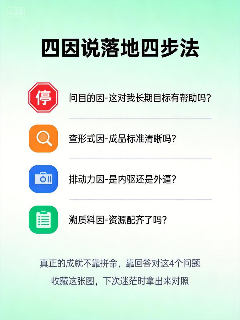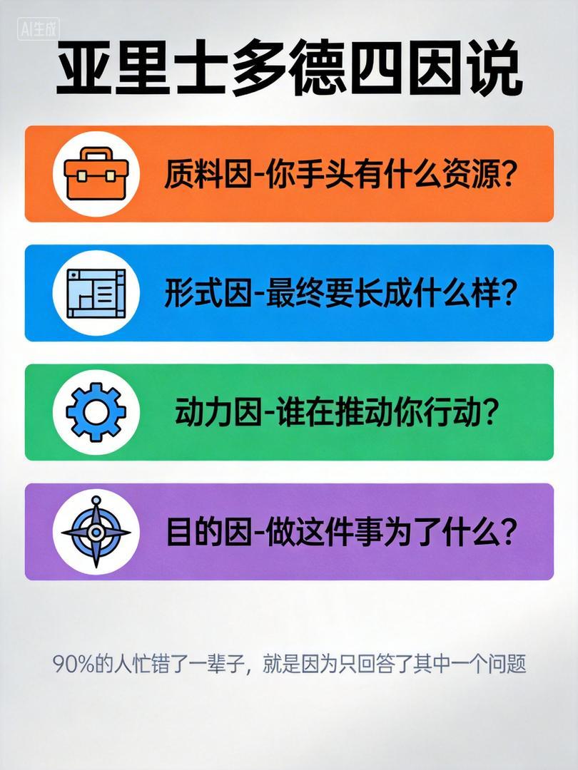 忙到崩溃?你缺这4个答案 2300年前哲学家给忙疯的现代人开出解药 职场生存 个人成长 亚里士多德 你以为努力不够?错!亚里士多德2300年前就说了,忙而无果是因为你少问了4个问题。 加班到凌晨、周末也在回消息、一年下来简历却没什么亮点——你是不是也这样?每天像个陀螺一样转,年底一看原地踏步。这不是你不够拼,是你根本没搞懂"成事"的底层逻辑。 古希腊哲学家亚里士多德在《物理学》里提出"四因说",任何事物的生成都需要四个条件。翻译成大白话就是:第一,质料因——你手头有什么资源?第二,形式因——最终要长成什么样?第三,动力因——谁在推动你行动?第四,目的因——做这件事到底为了什么? 90%的人忙错了一辈子,就是因为只回答了其中一个问题,甚至一个都没回答清楚。 怎么落地?记住这四步:接任务前先问"目的因"——这对我长期目标有帮助吗?没价值的忙,直接拒绝。执行中检查"形式因"——成品标准清晰吗?模糊的目标只会产出模糊的结果。卡顿时排查"动力因"——是内驱还是外逼?靠别人推着走,永远走不远。复盘时追溯"质料因"——资源配齐了吗?巧妇难为无米之炊。 我有个学员,之前同时接五个项目,累到住院。用四因说一分析,三个项目目的因不匹配,直接砍掉;剩下两个把形式因标准化,效率翻倍。现在他每天准点下班,业绩反而涨了40%。 瞎忙是时代的病,四因说是千年的药。真正的成就不靠拼命,靠回答对这4个问题。 你最近的项目卡在哪一因?质料、形式、动力还是目的?评论区告诉我,我用四因说帮你拆解。 点关注,用哲学把日子过明白。下次告诉你如何用四因说选对人生赛道,少走十年弯路。