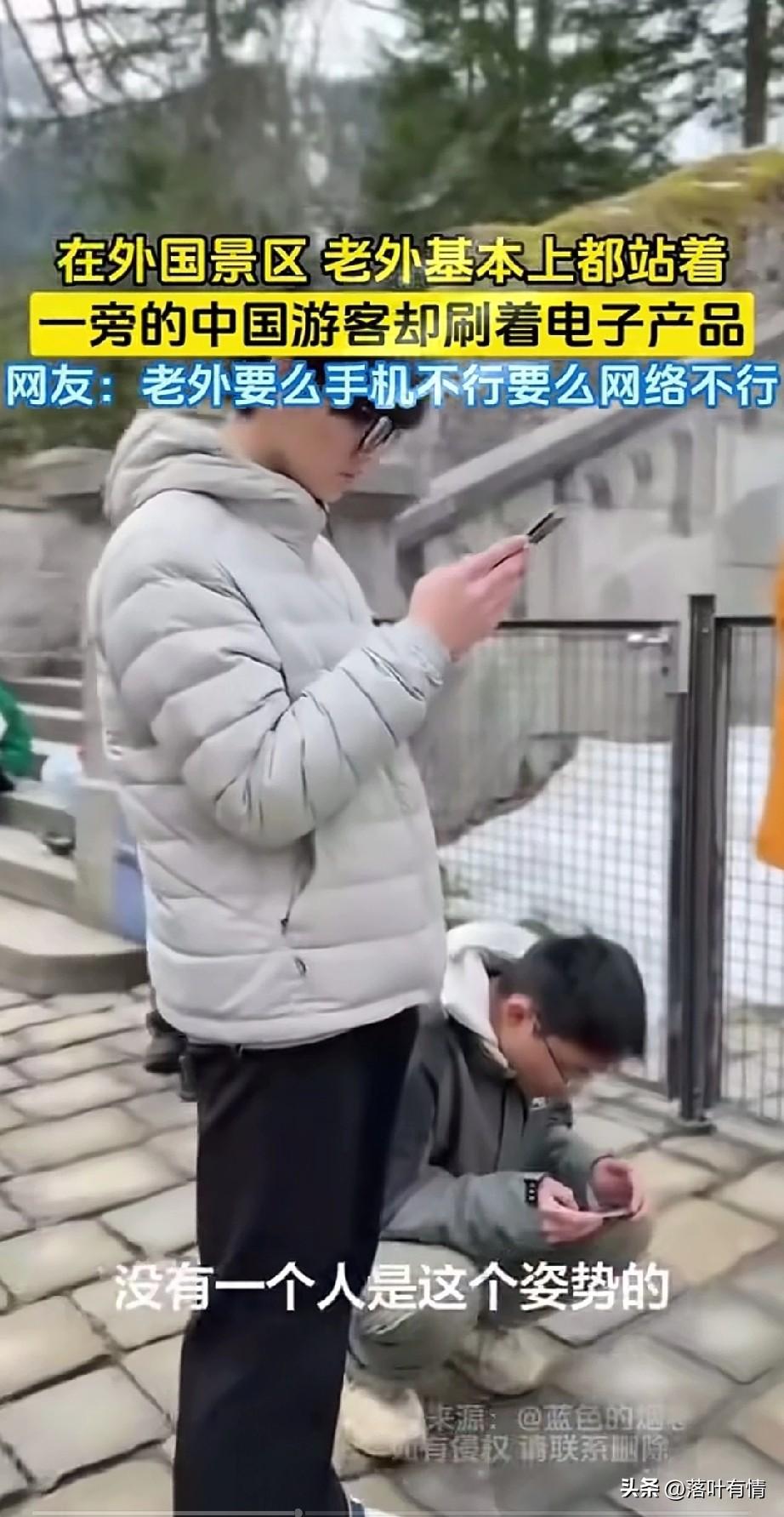 女子去国外旅行, 发现了一个奇怪的现象, 那就是在逛街逛累了之后, 周围的外国人都是站着, 很少有人玩手机, 反而周围的中国游客, 全部都在玩这手机, 都沉迷于电子游戏, 是老外的手机不够好吗? 还是老外5g信号不好, 或许是老外的手机没有流量, 大家觉得为什么会出现这样的情况?集卡领红包