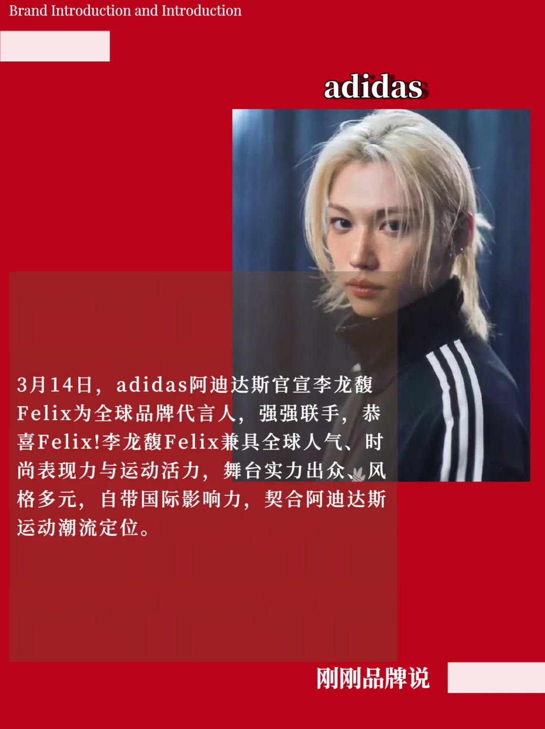 3月14日,adidas阿迪达斯官宣李龙馥Felix为全球品牌代言人,强强联手,恭喜Felix!李龙馥Felix兼具全球人气、时尚表现力与运动活力,舞台实力出众、风格多元,自带国际影响力,契合阿迪达斯运动潮流定位。