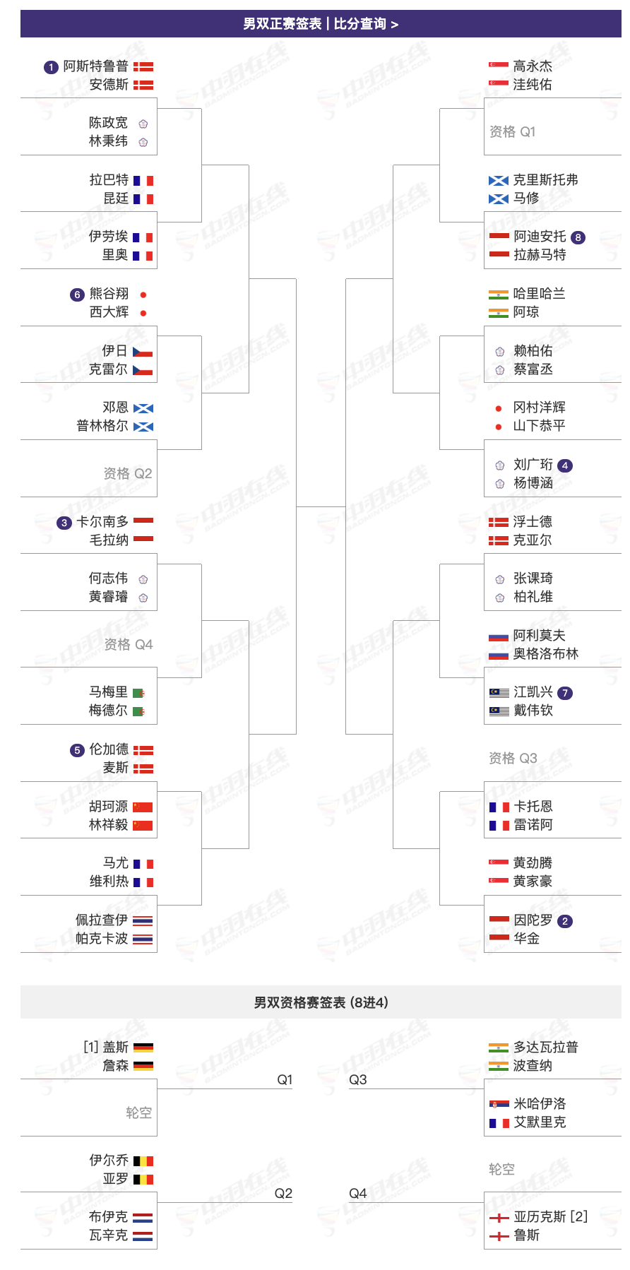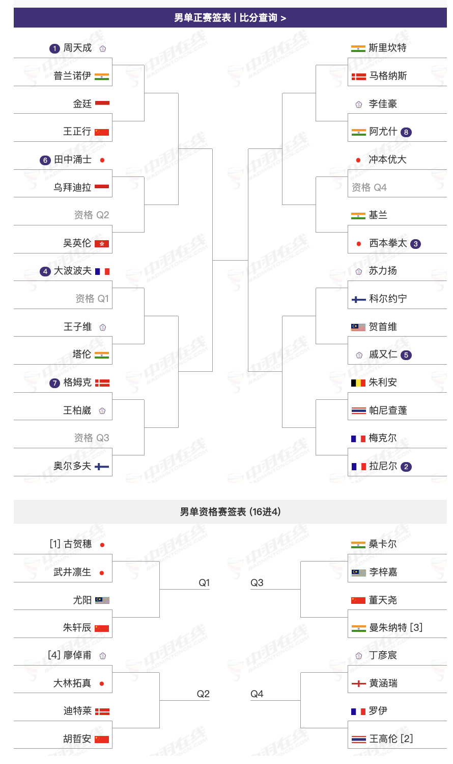 男单:王正行🇨🇳 vs 🇮🇩金廷朱轩辰🇨🇳 vs 🇲🇾尤阳(资格赛)董天尧🇨🇳 vs 🇮🇳曼朱纳特(资格赛)胡哲安🇨🇳 vs 🇩🇰迪特莱(资格赛)