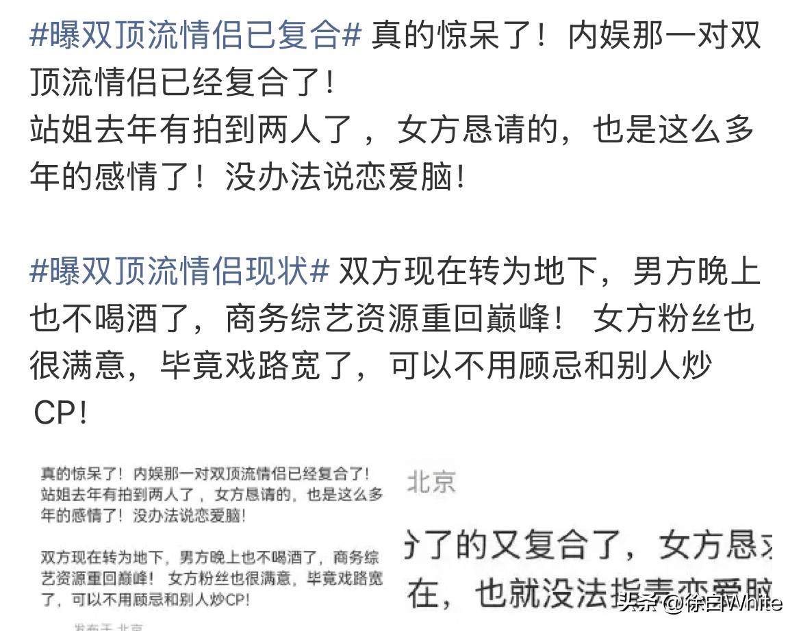 3月15日,看到热搜爆双顶流情侣已复合 字字不提鹿晗关晓彤,字字都指向他俩! 关键字:男方晚上不喝酒了,商务综艺资源重回巅峰,多年感情,女方求的复合,目前恋情转地下……一开始觉得好笑,目前内娱就没有双顶流的情侣好么?要么男顶女不顶,要么女顶男不顶,要么男女都不顶,双顶,不存在……关晓彤不算顶流,除了这点对不上,其他倒是都能对上!