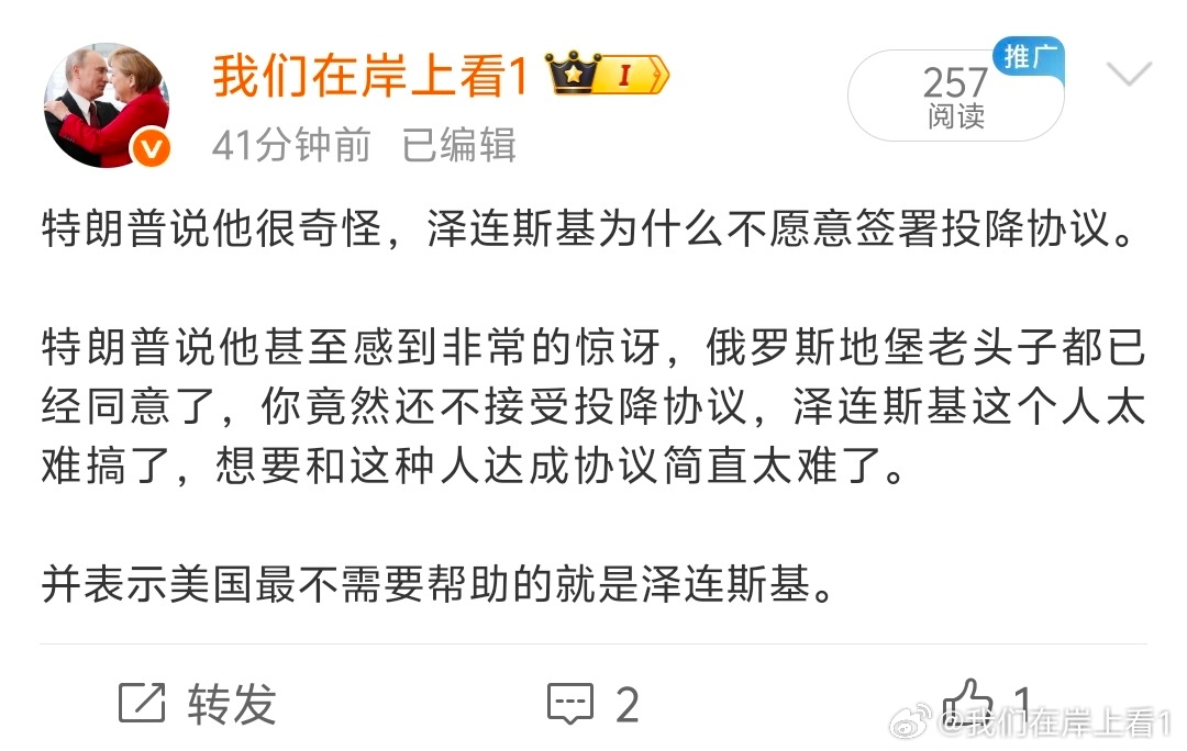 特朗普说美国最不需要帮助的就是泽连斯基,然后记者问特朗普,你说美国拥有世界上最好
