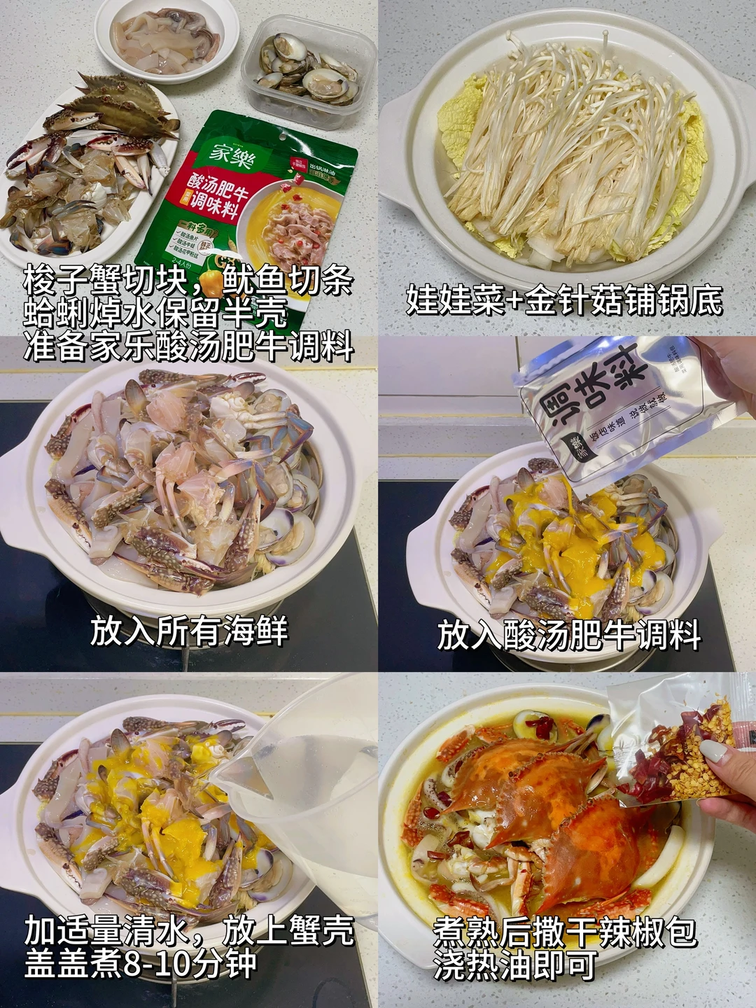 趁着螃蟹🦀肥美时,还可以做这道东坡蟹逅。用家乐酸汤肥牛调料,把酱包放入食材、加水煮熟就完成了,会烧开水就会做[哇R][哇R]色泽金黄、是正宗酸汤味,搭配海鲜味道特别鲜,真的太专业啦!