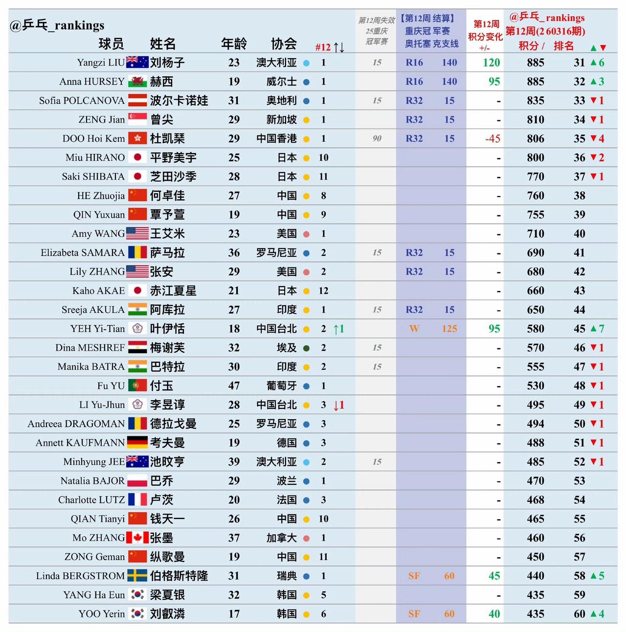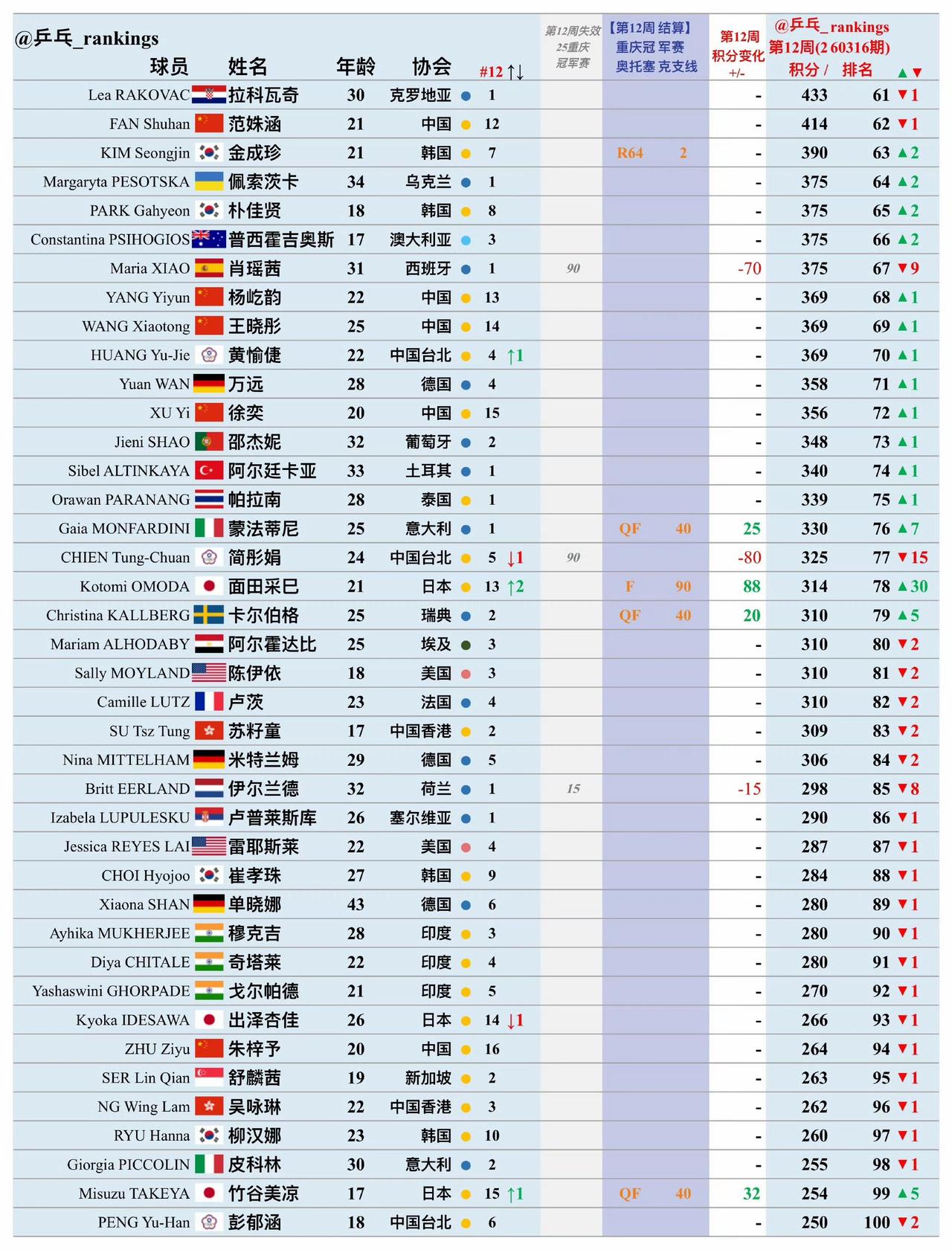 不敢相信,王艺迪已经排到第六位了, 申裕斌的排名应该算是“虚”低[捂脸], 国际乒联2026年第12周女单世界排名变化如图。 本周(2026.03.16)结算今晚刚刚结束的2026WTT重庆冠军赛的巨额积分。当然,去年的WTT重庆冠军赛积分相应失效。 孙颖莎、王曼昱、陈幸同依然稳稳占据前三,朱雨玲紧跟排在第四位。 刚刚夺冠的张本美和上升三个位次超过蒯曼来到了第五位,蒯曼第六位,陈熠第七位,大迪第八位。 大迪掉出前六,按说冠军赛就打不上了,但我们一般用金卡,大迪完全还可以打。 申裕斌排在第14位,很显然,她的实力应该在前十位。 伊藤美诚马上要掉大分了,估计桥本帆乃香就会上去了。