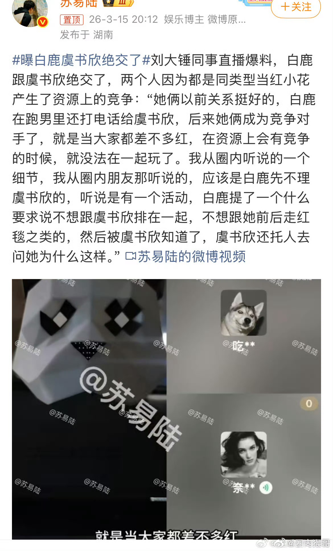 曝白鹿虞书欣绝交了刚获得电视剧品质盛典[年度品质影响力剧星]的白鹿wwzz,别来捆b,剧花和fzk不是一个赛道的,不如来看刚刚收官的古装大女主探案剧唐宫奇案和待播剧《莫离》吧!