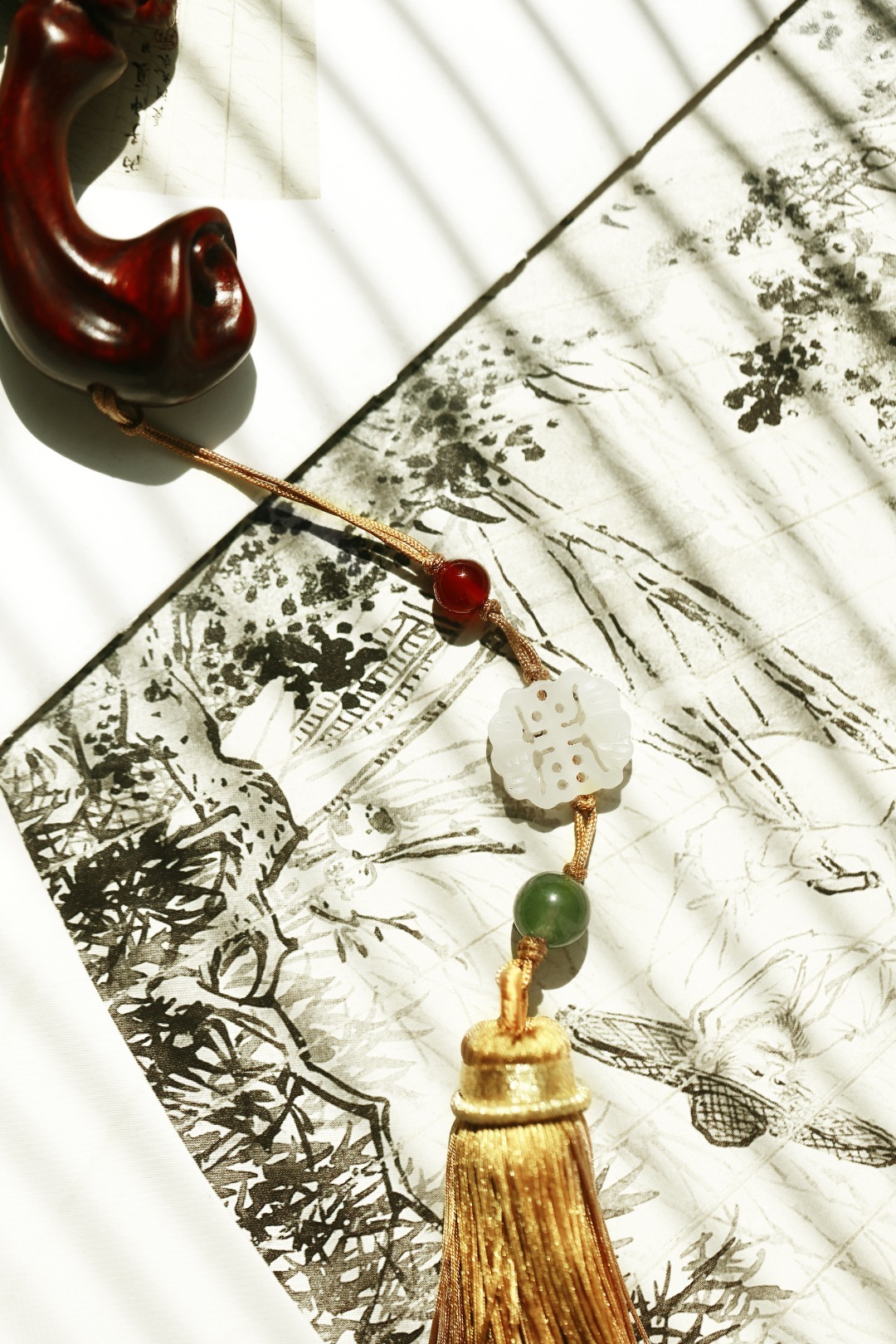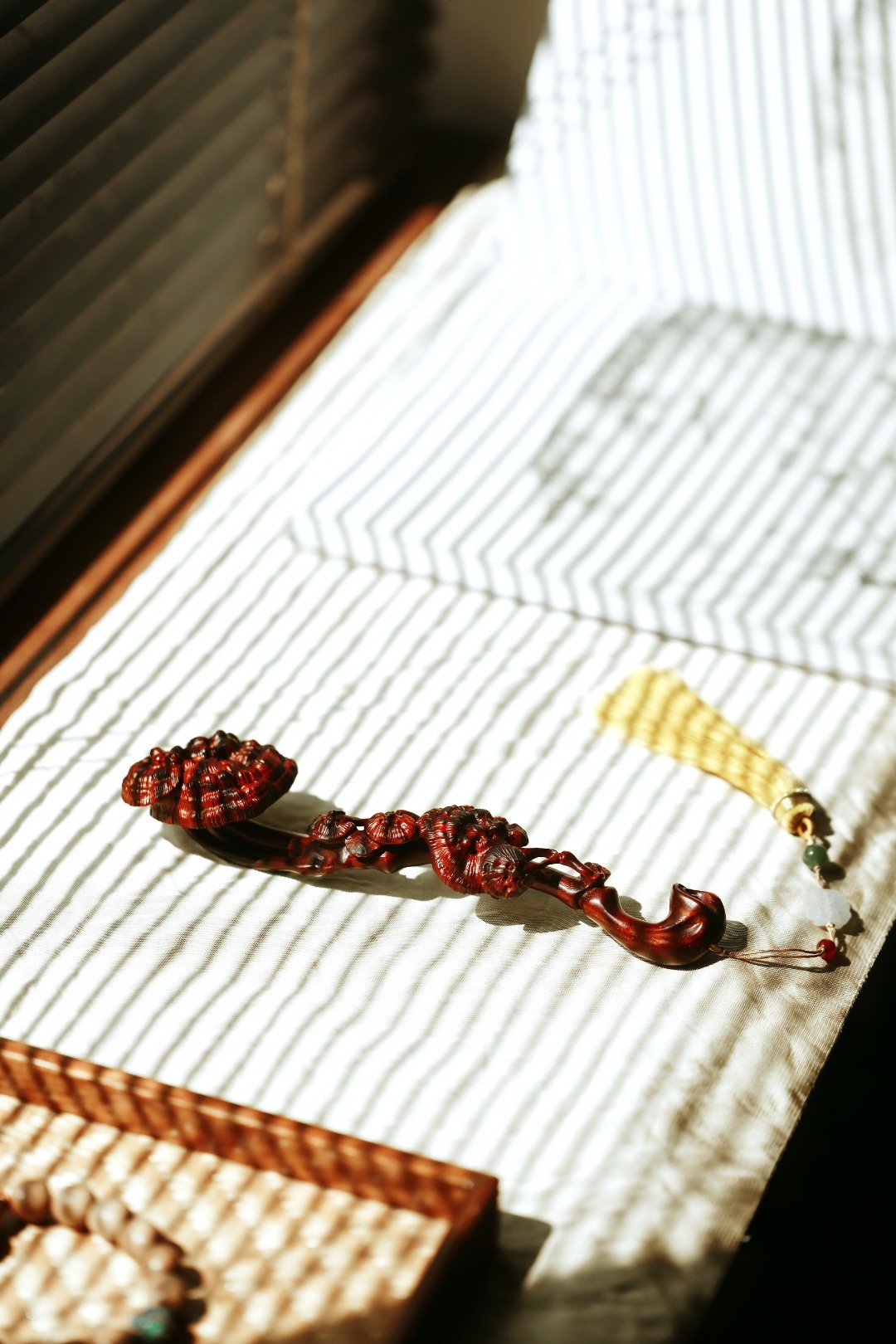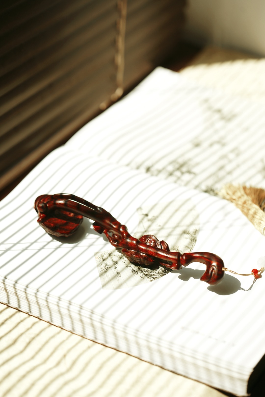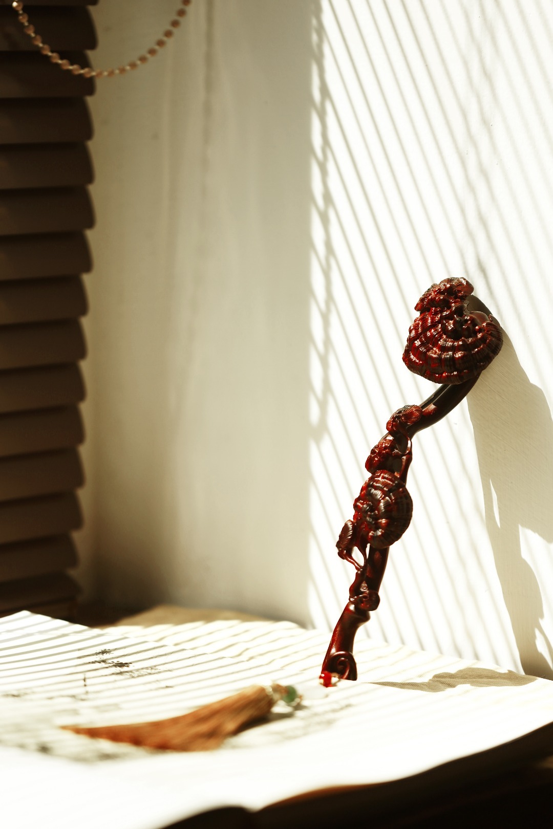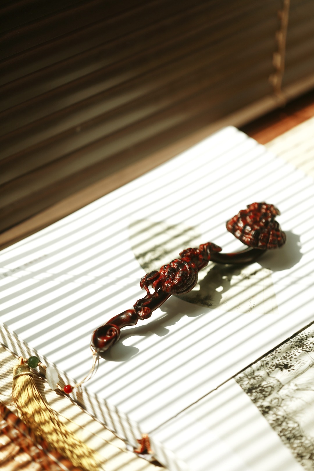 紫檀雕琢而成,柄首呈灵芝状,雕刻纹理如流水似流云,细腻精致,随形附势,搭配宫廷流苏。文房案头把玩陈列,文雅十分。