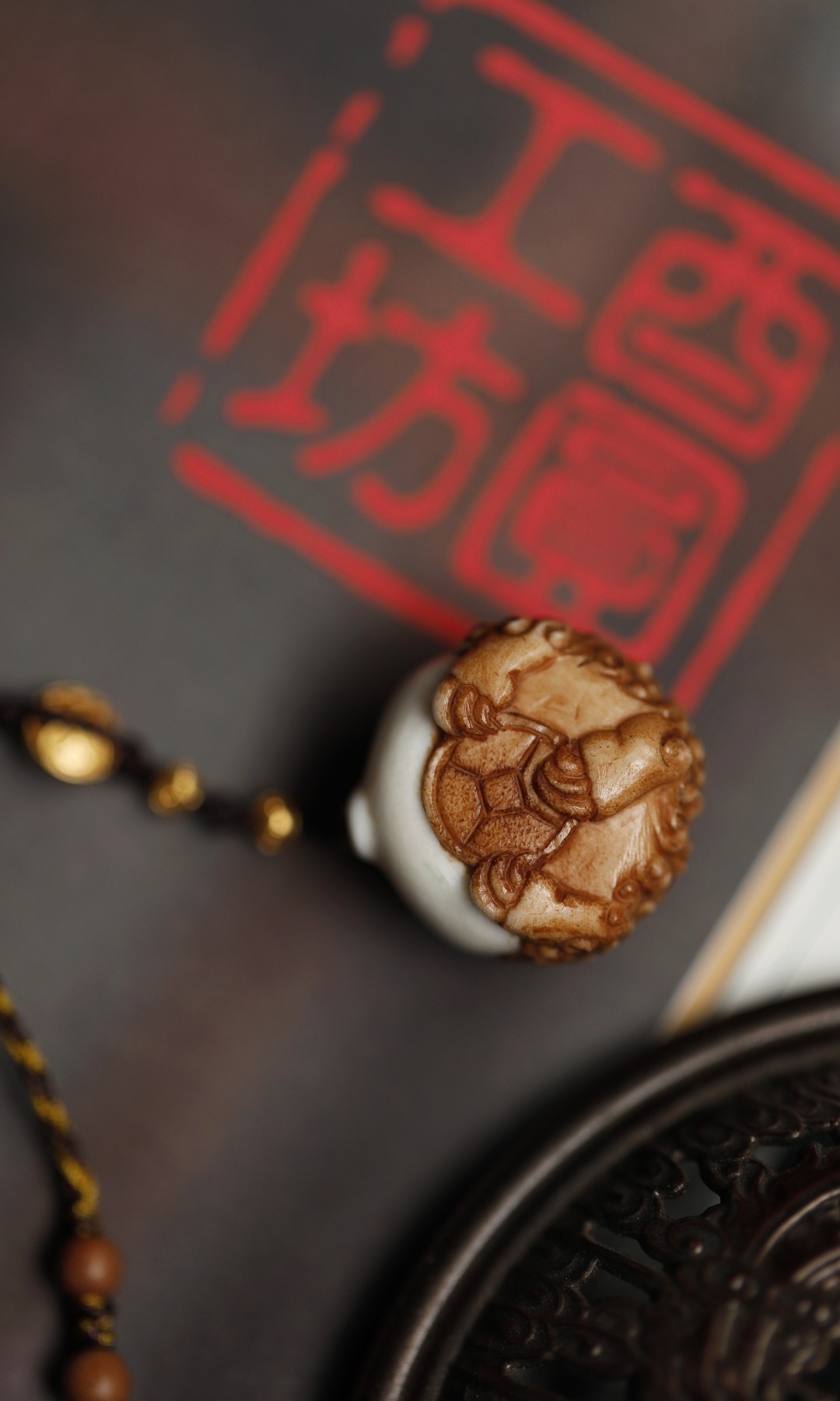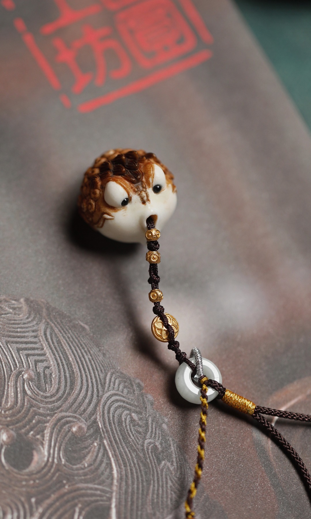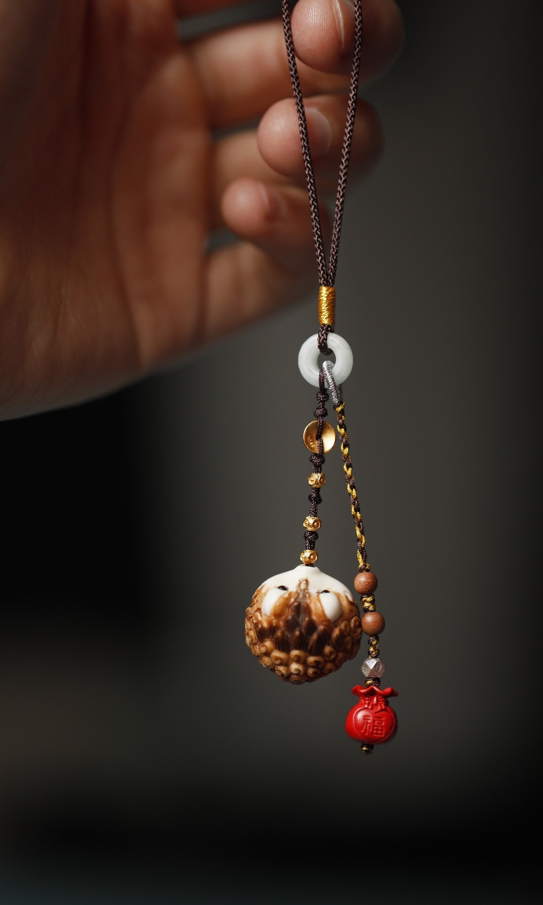 取材鹿角,植物根付,名家手刻,金蟾吸金,观之有趣,玩之怡然,悬挂古意横生,别致独特。