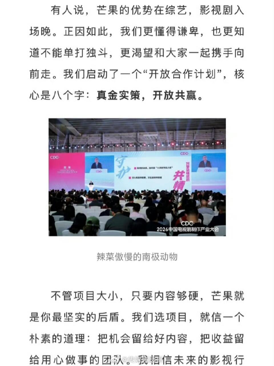 芒果的战略是“共创”,给市场专业化制作公司更多机会,通过激励机制促进长剧市场回春,专业的事交给专业团队去做,创作者需要好的创作环境和公平的收益,观众也需要有创新的高质量作品,演员也需要好的项目班底和剧本去发挥演技,市场永远是宏大且有潜力的!影视平台不该短视,为了成本收益权利掌握在自己手里选择自己做蛋糕,反而把蛋糕越做越小;更该靠良性发展把行业蛋糕共同做大,蛋糕足够大时,哪怕只取属于自己的一份,也远比死守小蛋糕丰厚得多。