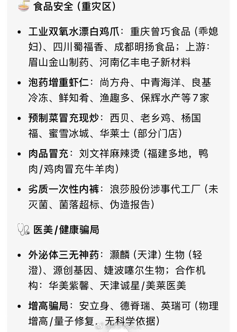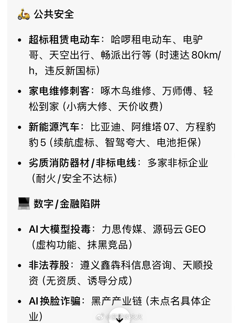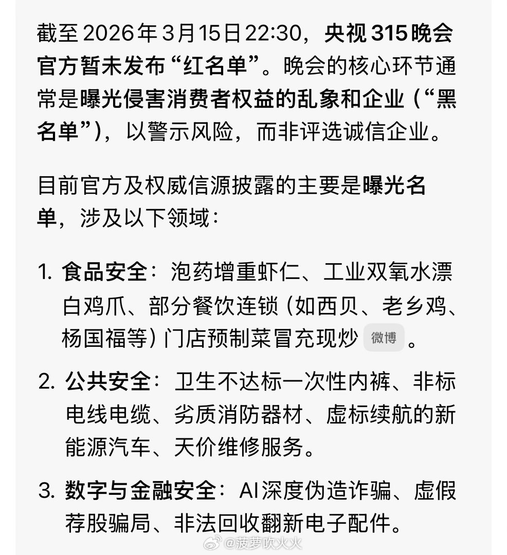 315晚会红名单‼️315晚会没有红名单目前官方及权威信源披露的主要是曝光名单,涉及以下领域:1. 食品安全:泡药增重虾仁、工业双氧水漂白鸡爪、部分餐饮连锁(如西贝、老乡鸡、杨国福等)门店预制菜冒充现炒。2. 公共安全:卫生不达标一次性内裤、非标电线电缆、劣质消防器材、虚标续航的新能源汽车、天价维修服务。3. 数字与金融安全:AI深度伪造诈骗、虚假荐股骗局、非法回收翻新电子配件。‼️“红名单”或诚信企业,建议以官方渠道的后续通报为准。