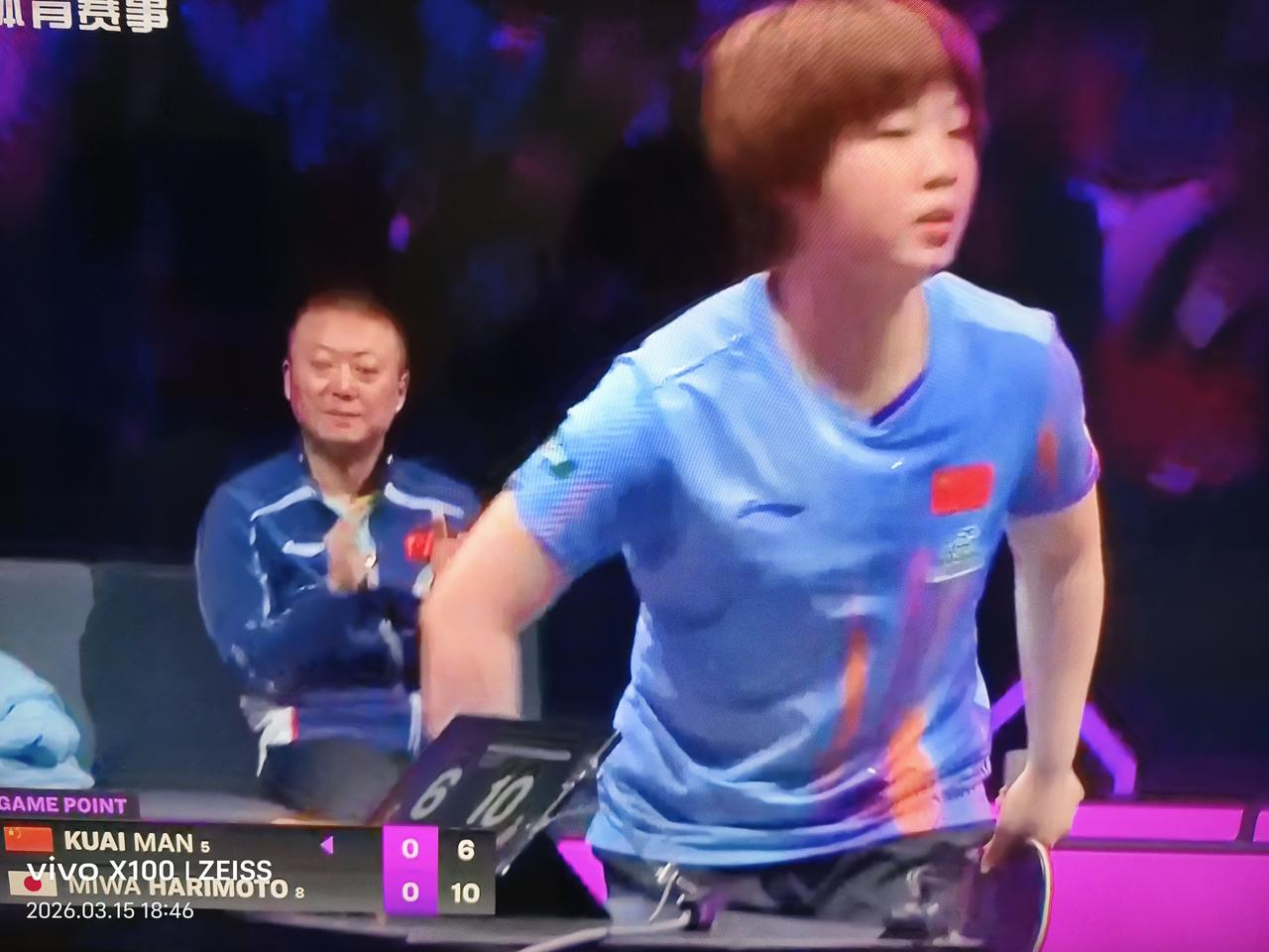 全来了!男队、女队选手全来了! 都说莎莎也来了,但我从图上就是找不到莎莎,也找不到曼昱。 前两局蒯曼🇨🇳6-11,11-9追平了张本美和🇯🇵,目前第三局蒯曼🇨🇳7-5占据比分优势了! 这是2026WTT冠军赛重庆站女单决赛。 好好好!第三局蒯曼🇨🇳11-7拿下张本美和🇯🇵,大比分蒯曼2-1领先[赞][奋斗]! 蒯曼继续加油!