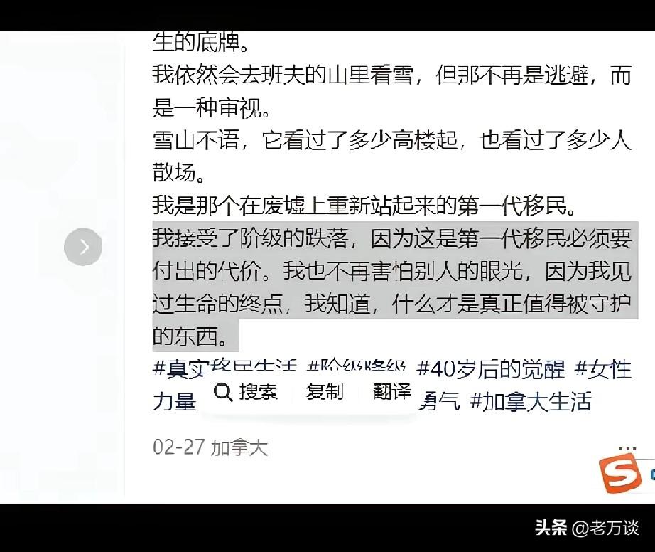 国内少了一个美女主持人,加拿大多了一个美女护工。这位美女把自己身份的改变说的如此的诗意盎然。他接受了阶级的跌落,因为这是第一代移民必须付出的代价,她也不害怕别人投来异样的眼光,她知道自己要守护的东西,国外到底有什么美妙的东西,能够让她如此的放低姿态。从主持人到护工,这简直就是天堂跟人间,相差甚远。而她能够做到如此的坦然,并没有因为身份的改变而萎靡,反而活得更加的洒脱,真是太奇怪了。难道外国的身份能让他忘记工作的烦恼,能让他得到人生的升华?