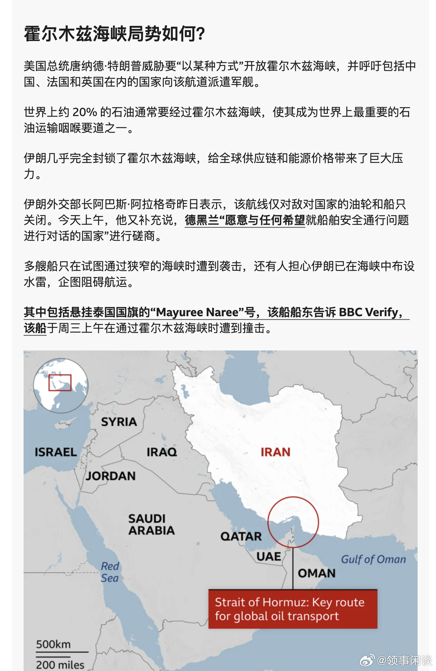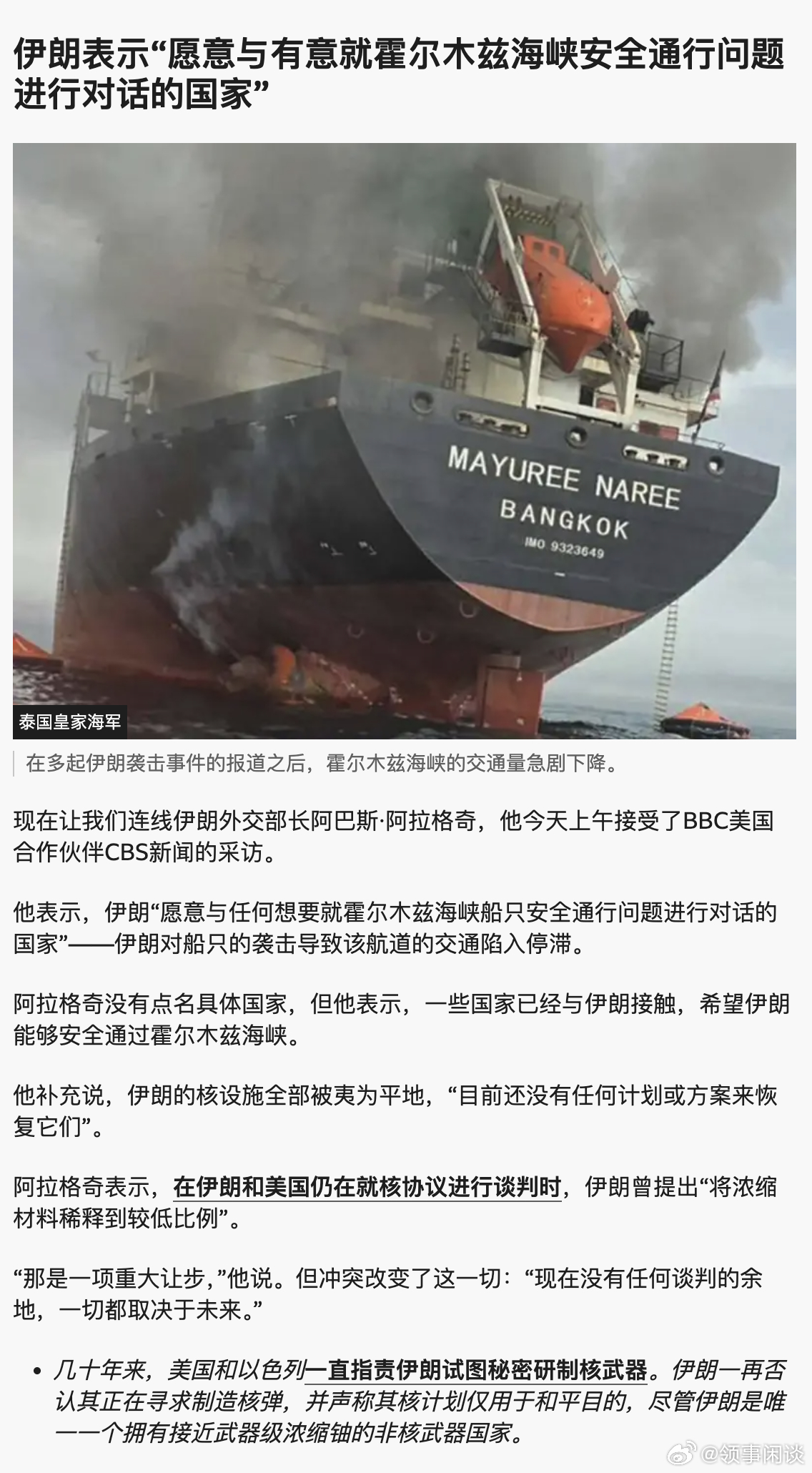 【伊朗外交部长阿巴斯·阿拉格奇:霍尔木兹海峡航线仅对敌对国家的油轮和船只关闭】(