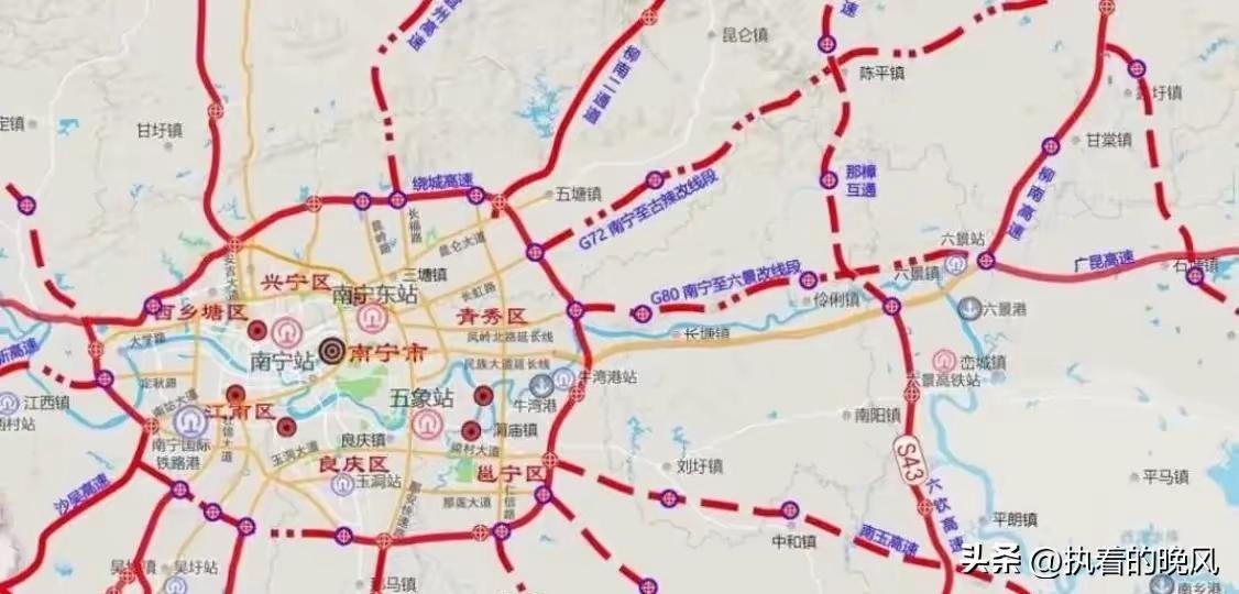 面对南宁把泉南高速和广昆高速外移了之后,原来的路段改为快速路我个人是这样做比较合适,就是考虑把图2广昆高速南宁至六景段外移了之后,顺便再考虑把泉南高速一起共线,主要的原因是因为泉南高速南宁至古辣段外移线路和梧硕高速梧州至古辣段合并为南梧高速,同时也做好广昆高速回归不经过玉林市的方案,就是把南梧高速纳入为广昆高速纳入为广昆高速的其中一部分。等广昆高速南宁至岑溪段扩建后仍然拥堵就考虑把南梧高速纳入为广昆高速的其中一部分,取消和泉南高速的共线。让广昆高速放弃经过玉林市中心,拉直南宁至梧州段的距离,让广昆高速广东段打造成为南宁至梧州至广州走廊经济带。