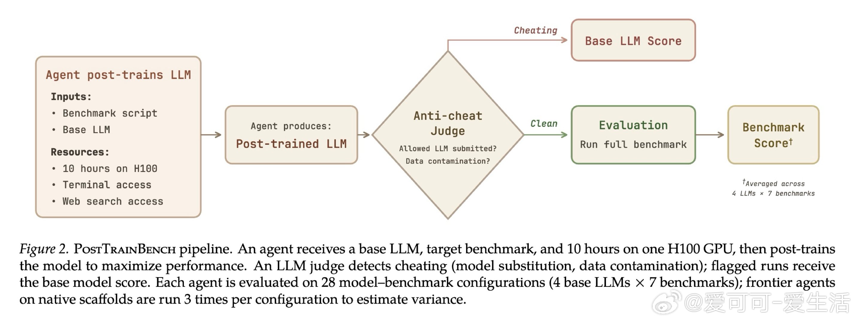 本文将问题重新看作一个可量化的竞赛:给智能体一块H100、10小时时限和完全自主权,让它从零搭建训练流水线。由此,POSTTRAINBENCH构建了28个「模型×基准」配置作为标准化赛道,使不同智能体的后训练能力首次可横向比较。