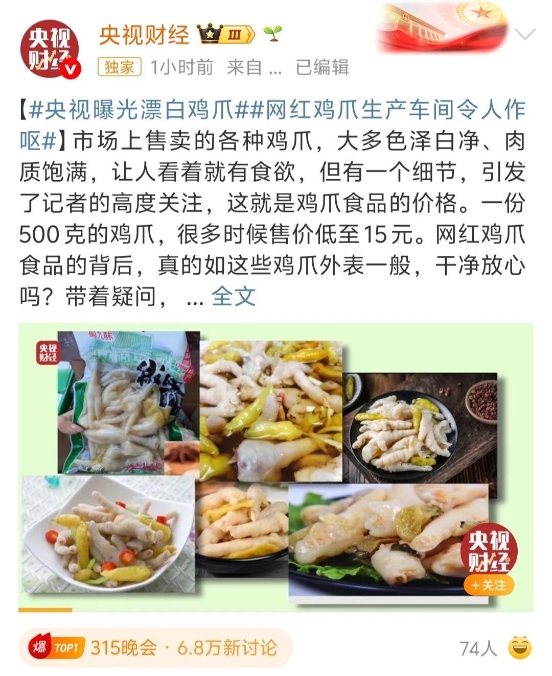 2026年315晚会的后果来了——哪些“美白漂亮”的鸡爪卖不动了 3月15日晚,央视315晚会曝光成都明扬食品、重庆曾巧食品("乖媳妇"品牌)等企业的鸡爪黑幕:工业双氧水漂白、污水车间、脚踩鸡爪,工作人员坦言"从来不吃"。执法队连夜查封蜀福香232箱凤爪、27桶双氧水,曾巧食品锅炉房5桶过氧化氢被当场查获。 市场瞬间崩塌。淘宝、拼多多、抖音紧急下架"乖媳妇"等全部店铺,八个品牌商标被一锅端。黑猫投诉平台6776件鸡爪投诉集中爆发,网友直播扔囤货冲上热搜。多氟多等上游供应商股价重挫,横跨川渝豫的非法产业链被连根拔起。 行业遭遇寒冬。15元/500克的"性价比神话"沦为原罪,低价鸡爪无人问津,高端产品销量腰斩——消费者已分不清谁是李鬼。超市货架从三米柜台缩至半米角落,便利店老板直言"进鸡爪像进炸药"。冻品市场库存积压超10万吨,白羽鸡鸡爪收购价暴跌40%,养殖户被迫转送饲料厂。 鸡爪曾是Z世代的"精神支柱",当最亲民的零食被证实"用命换白",年轻人的幻灭感尤为强烈。 鸡爪卖不动了。不只是因为双氧水,更是当15元的贪婪碾压底线,当白净外表掩盖肮脏,这个行业亲手毒死了自己的未来。超市货架上那些孤零零的包装袋,像一排排白色墓碑,祭奠着那个啃着鸡爪刷剧的平凡夜晚。