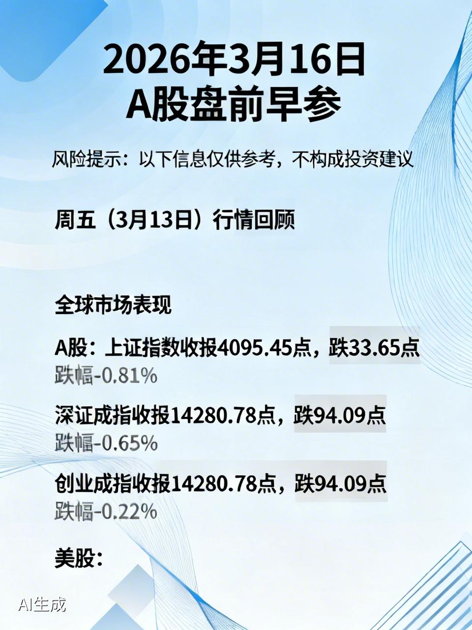 2026年3月16日 A股盘前早参 风险提示:以下信息仅供参考,不构成投资建议 一、周五(3月13日)行情回顾 全球市场表现 1. A股: 上证指数收报 4095.45点,跌33.65点,跌幅 -0.81%; 深证成指收报 14280.78点,跌94.09点,跌幅 -0.65%; 创业板指收报 3310.28点,跌7.24点,跌幅 -0.22%。 2. 美股: 道琼斯收报 46558.47点,跌119.38点,跌幅 -0.26%; 纳斯达克收报 22105.36点,跌206.62点,跌幅 -0.93%; 标普500收报 6632.19点,跌40.43点,跌幅 -0.61%。 3. 港股: 恒生指数收报 25465.60点,跌251.16点,跌幅 -0.98%; 国企指数跌0.32%,恒生科技指数跌0.99%; 南向资金当日净买入 184.49亿港元(沪股通118.13亿,深股通66.36亿)。 4. 商品与外汇: NYMEX原油暴涨 3.74% 至99.31美元/桶; COMEX黄金大跌 -2.00% 至5023.1美元/盎司; 美元兑离岸人民币报 6.9005,微跌0.10%; 美元指数报100.47,微跌0.02%。 二、国内财经要闻 1. 央行今日开展 5000亿元6个月期买断式逆回购,投放中长期资金稳定流动性。 2. 10:00国家统计局公布1-2月工业增加值、社零、固投,市场预期社零增速1.6%-2.5%、工业增约5.2%。 3. 1.3万亿超长期特别国债细则公布,首批2000亿,投向基建、设备更新、以旧换新。 4. 中美第六轮经贸会谈将在法国举行;美方重启301调查,中方严正回应。 5. 3月20日LPR大概率维持3.45%/3.95%不变。 三、海外财经要闻 1. 英伟达GTC大会今日开幕,3月17日凌晨黄仁勋演讲,聚焦Rubin平台、1.6nm GPU、HBM4、CPO光互联,利好AI算力、光模块、液冷。 2. 美国1月核心PCE同比3.1%超预期,降息预期推迟至9月;今晚6个月期国债竞拍。 3. 美国OFC光通信大会(3.15-19)举行,聚焦1.6T光模块、CPO量产。 四、重要公司公告(今日重点) 1. 寒武纪(688256):今日摘U,简称变更为“寒武纪”,科创板首家摘U出层公司。 2. 锴威特(688246):今日起停牌,筹划收购晶艺半导体控制权,预计停牌不超10个交易日。 3. 东吴证券(601555):今日复牌,发行股份及支付现金购买资产预案获通过。 4. 真爱美家(003041):控制权变更完成,新控股股东为广州探迹远擎。 5. 聚辰股份(688123):控股股东拟**合计减持不超2.61%**股份。 6. 复旦微电(688385)、神马股份(600810):今日召开临时股东大会。 五、盘前要点 1. 今日核心看点:1-2月宏观经济数据 + 英伟达GTC大会,科技与顺周期板块或共振。 2. 流动性:央行5000亿中长期资金投放,市场流动性充裕。 3. 板块关注:AI算力、光模块、液冷、基建、高端制造、消费。 大盘分析行情 美股大盘指数