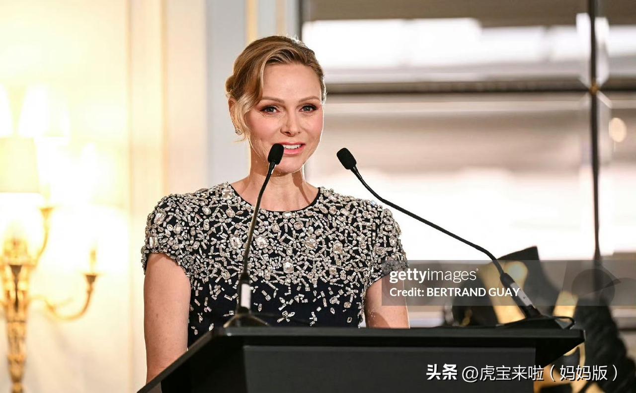 阿尔贝亲王和夏琳王妃出席慈善晚宴!夏琳王妃的bling bling藏蓝色亮片礼服衬托出好身材!