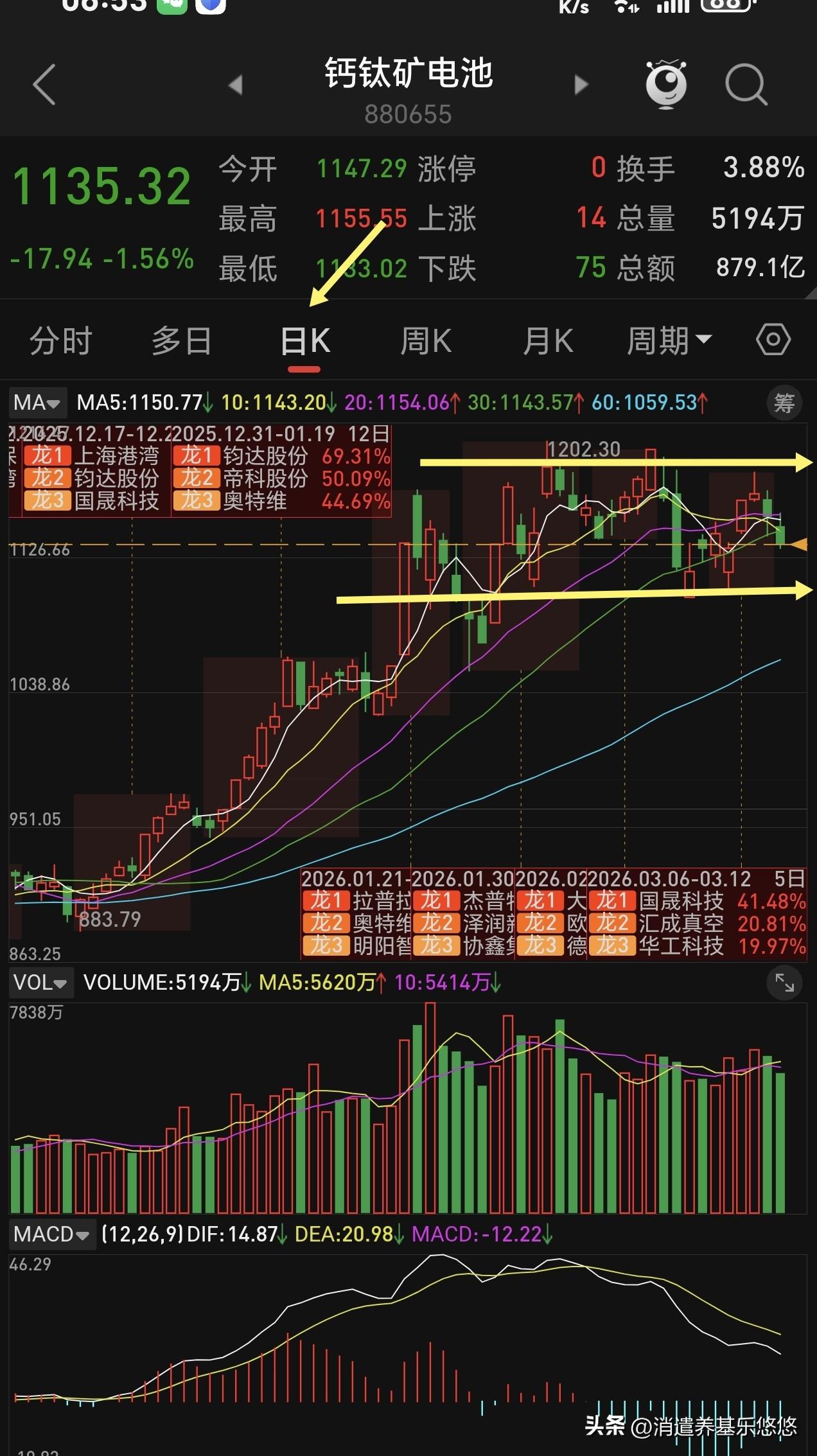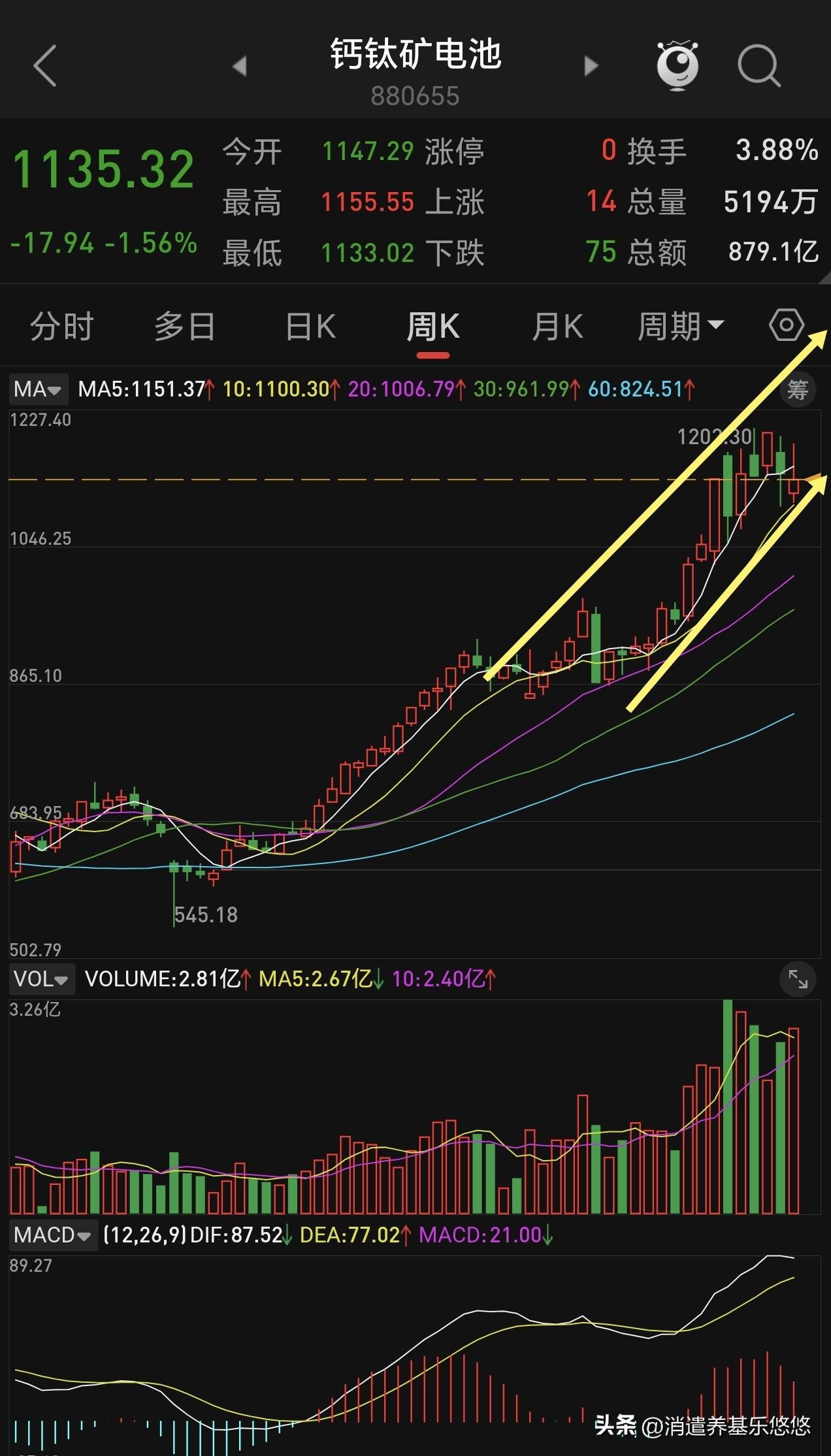 钙钛电池是电池板块细分概念,处于中长期上涨趋势中,目前回踩就是低吸机会。请看以下板块日线周线走势图,日线无论哪个走势(图一图二)短线回调空间都不大,距离下方支撑比较小,周线还处于上升通道中(图三),中期没有大的风险。喜欢它的可以分期逢跌低吸布局,代表基金比较多,011579汇丰晋信等。钙钛电池、锂电池、刀片电池,锂电池等等都是储能概念电池的一种,只是持仓股票细分有点区别,有时候涨跌幅度不一样。