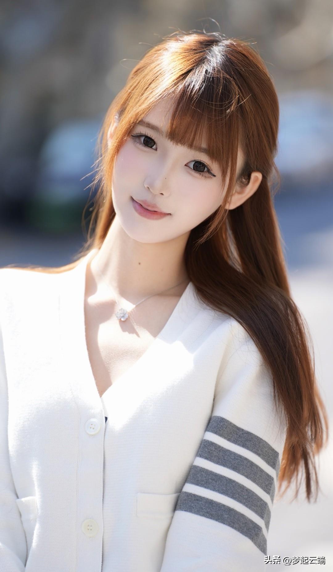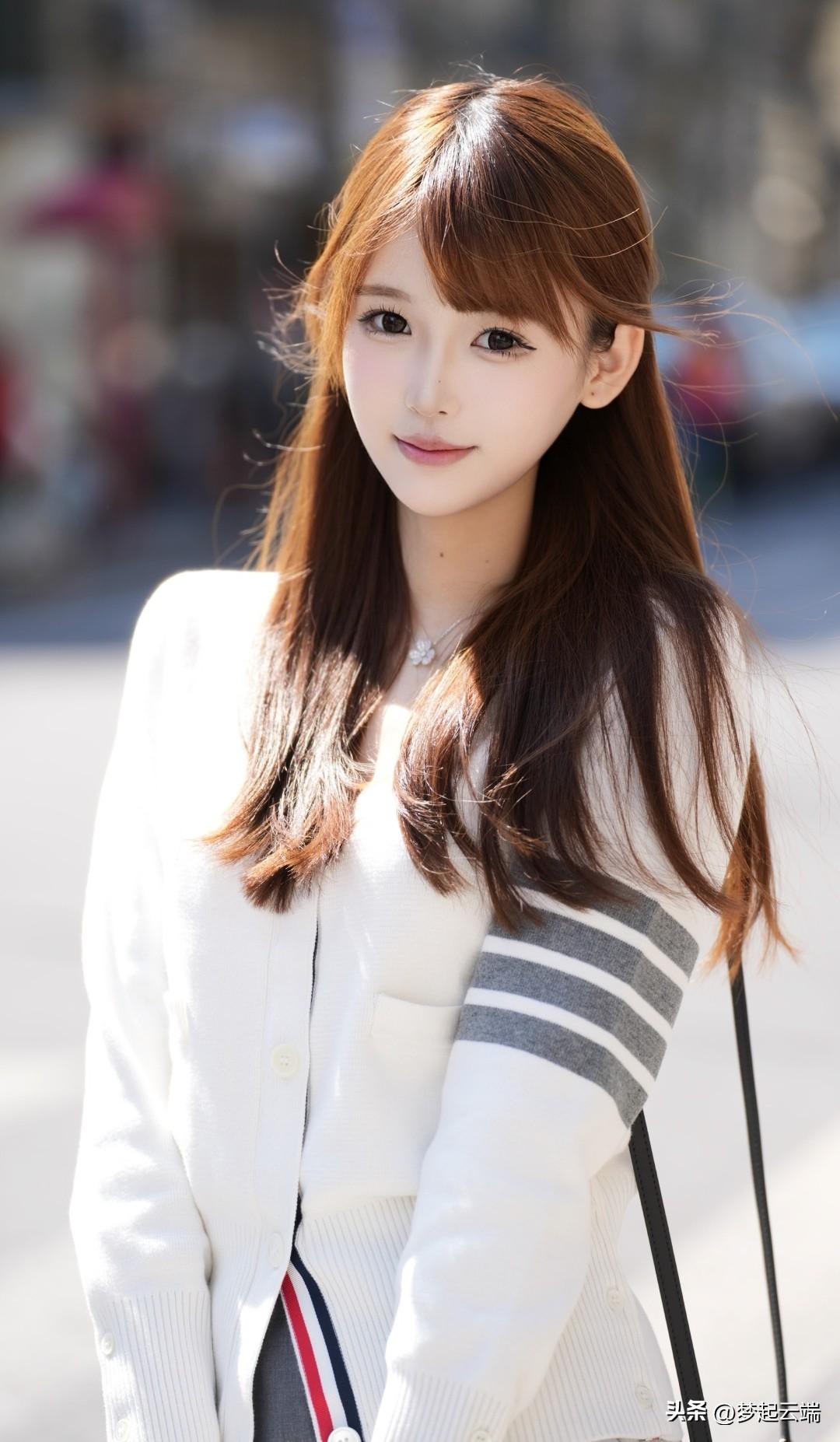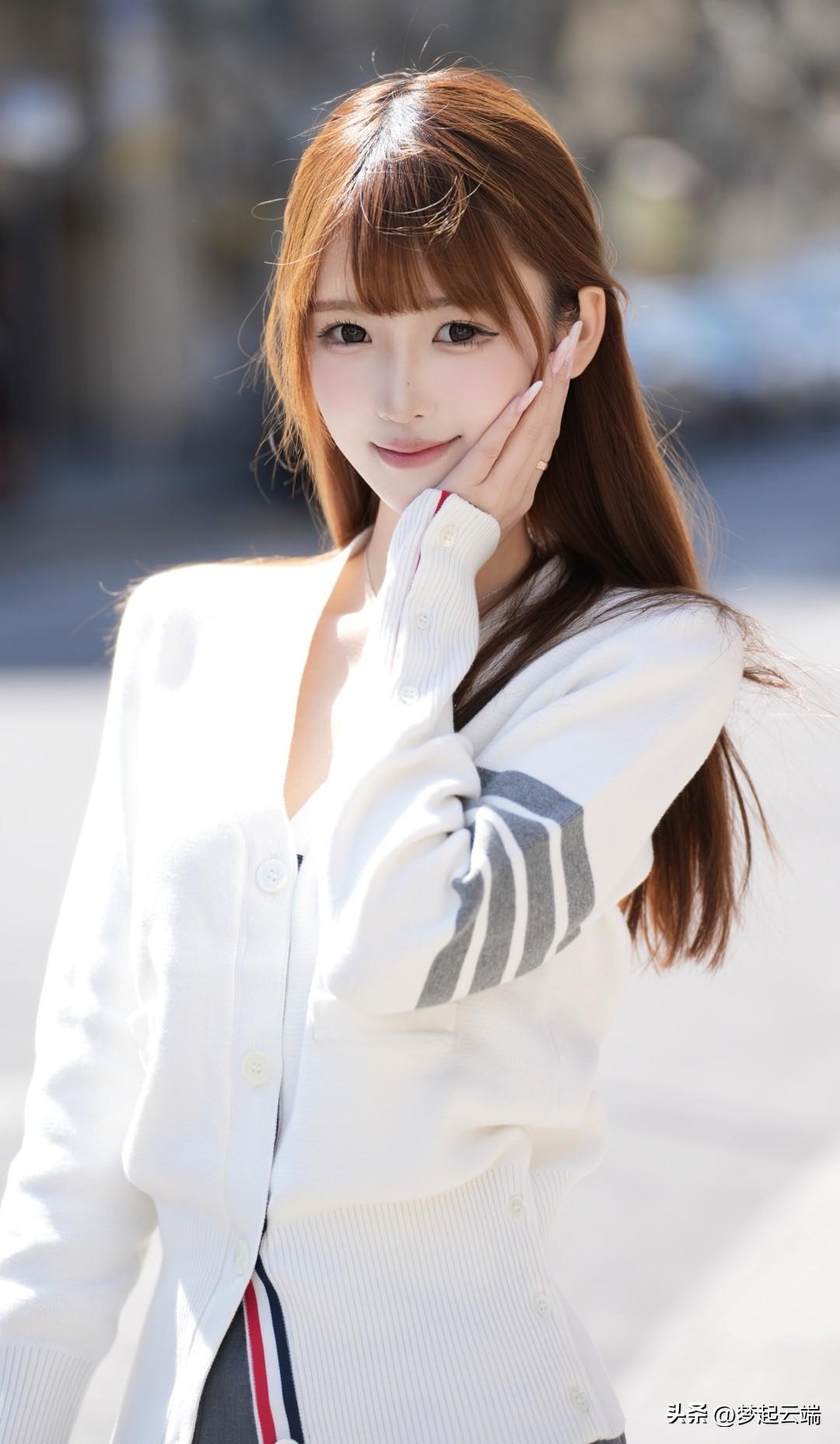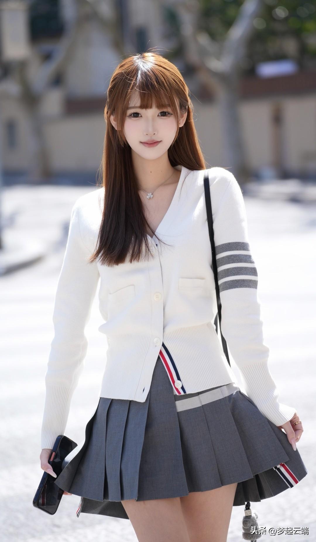 温柔甜美的春日穿搭,白色毛衣搭配短裙,清新自然。