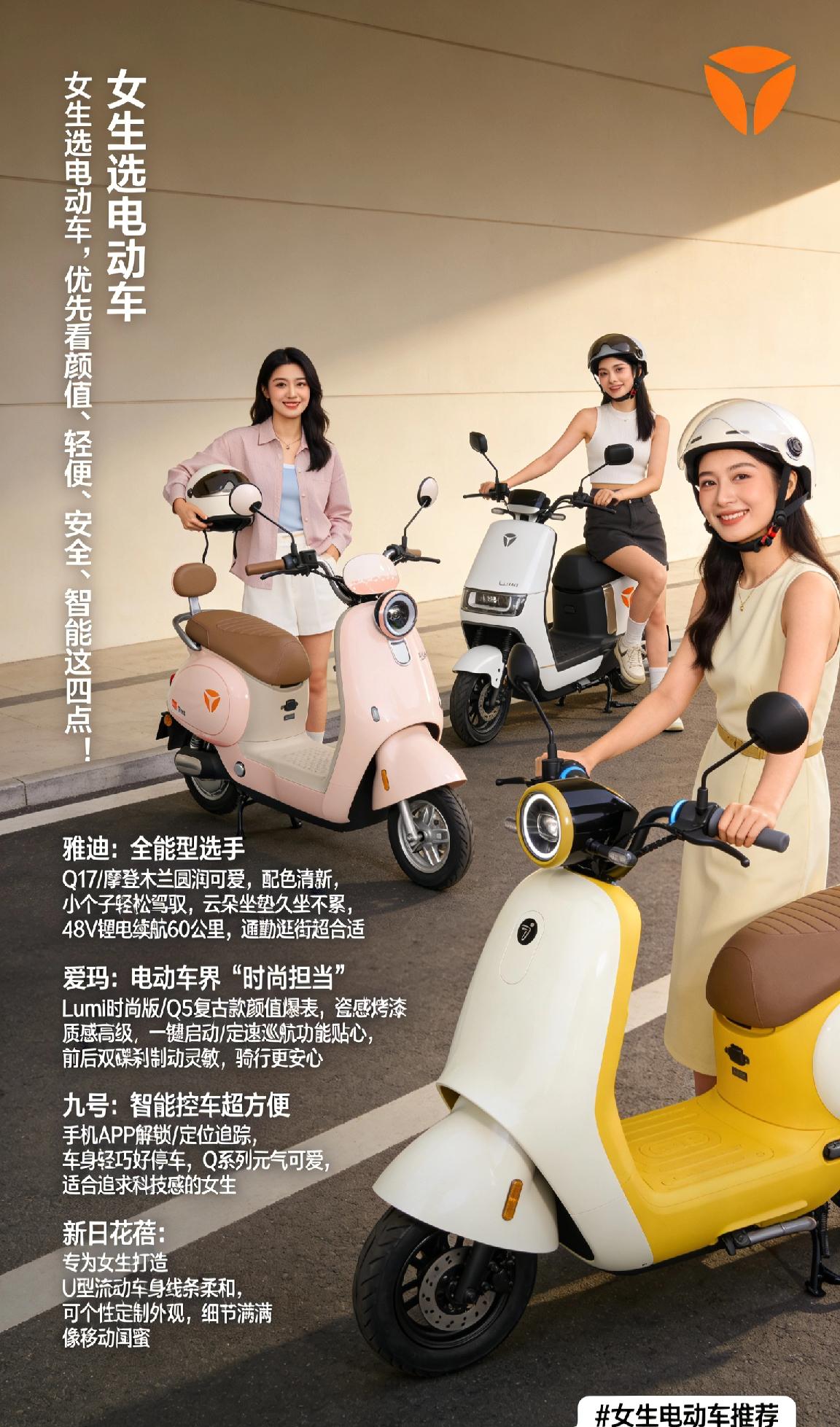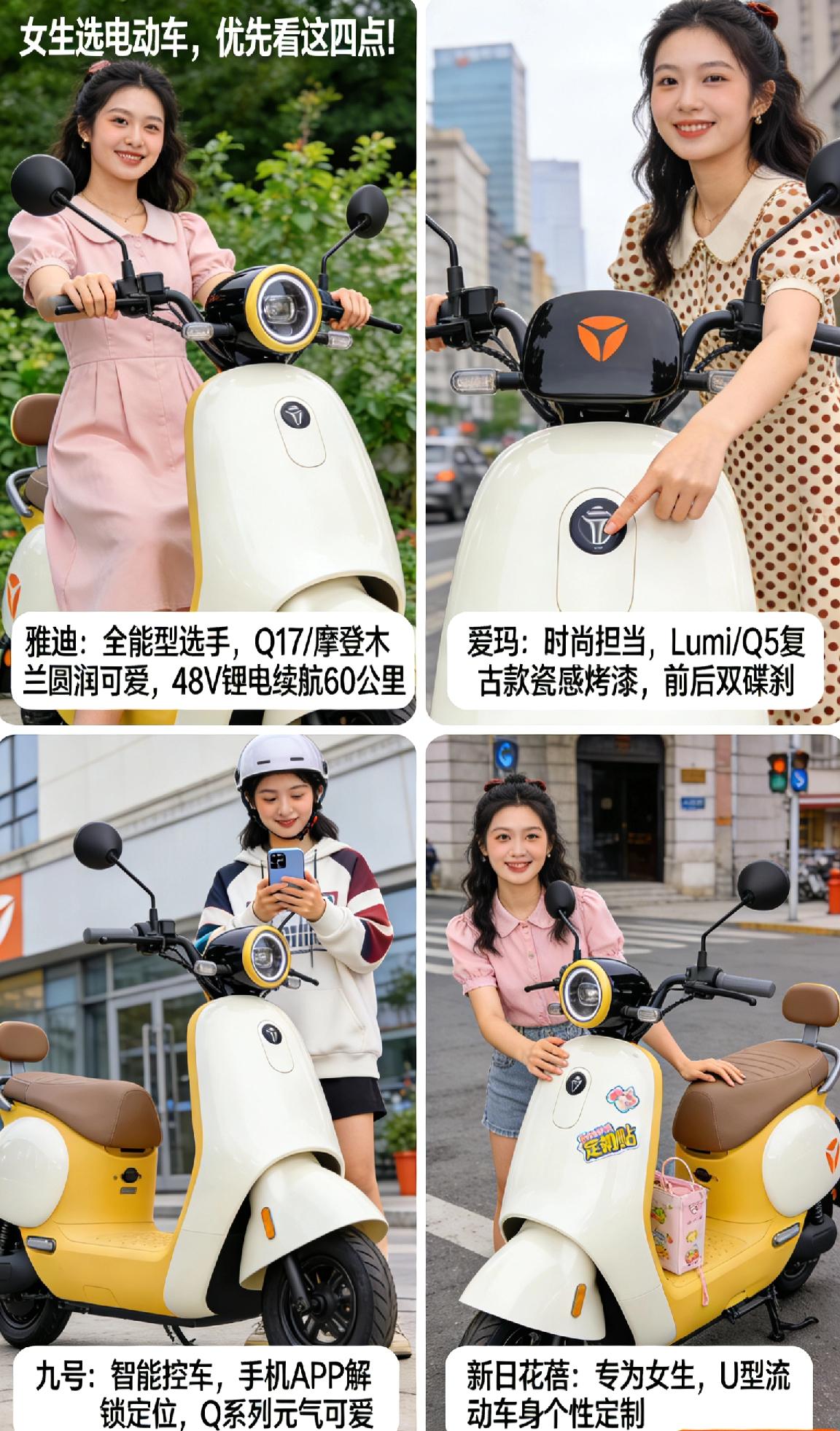 雅迪:全能型选手,Q17、摩登木兰等车型圆润可爱,配色清新,小个子女生也能轻松驾驭,云朵坐垫久坐不累,48V锂电续航可达60公里,通勤逛街超合适。 爱玛:电动车界“时尚担当”,Lumi时尚版、Q5复古款颜值爆表,瓷感烤漆质感高级,一键启动、定速巡航等功能贴心,前后双碟刹制动灵敏,骑行更安心。 九号:智能控车超方便,手机APP解锁、定位追踪,车身轻巧好停车,Q系列元气可爱,适合追求科技感的女生。 新日花蓓:专为女生打造,U型流动车身线条柔和,可个性定制外观,细节满满像移动闺蜜。 选对品牌,日常代步幸福感翻倍~(个人观点,仅供参考) 女生电动车推荐 新国标电动车