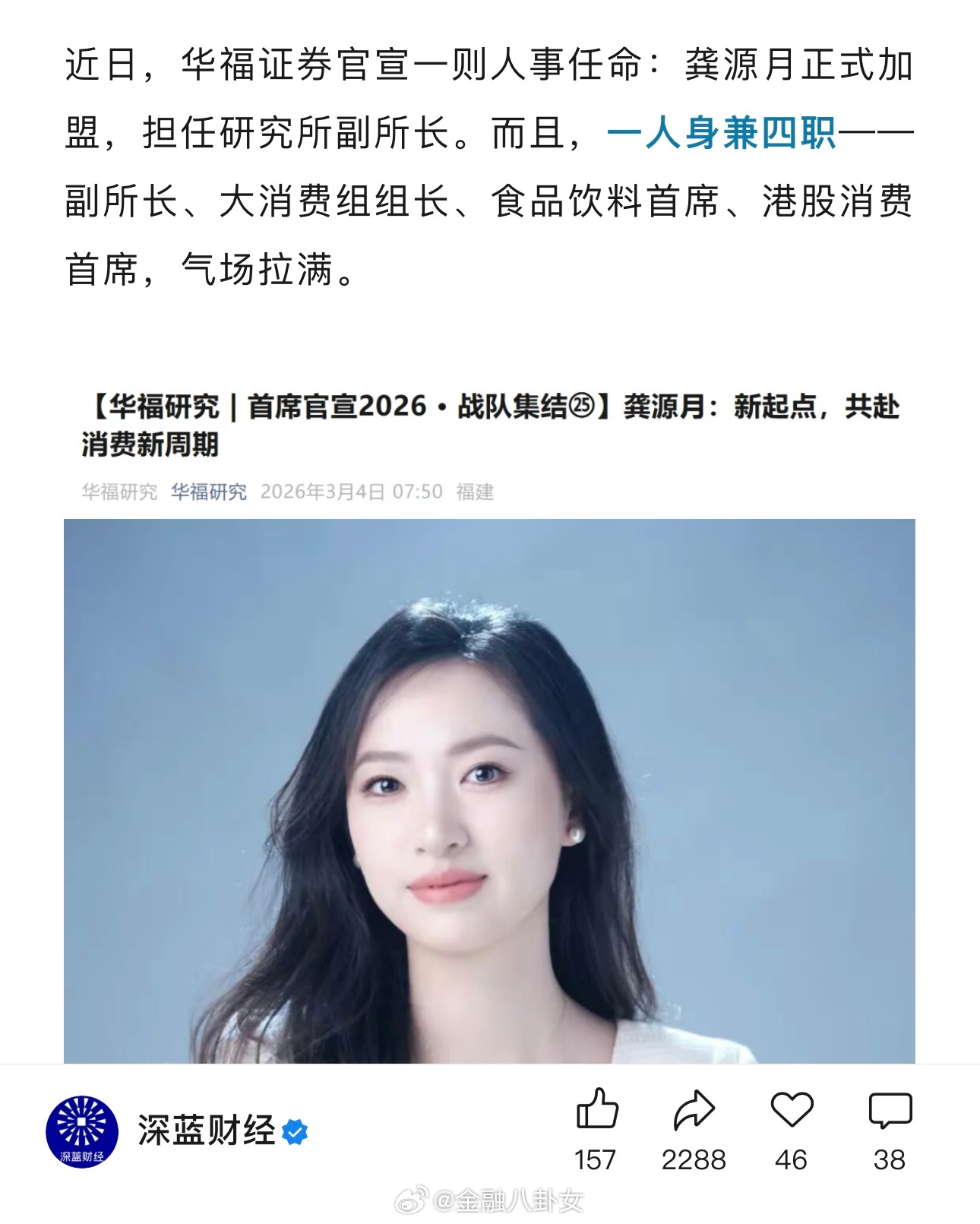 华福证券官宣一则人事任命:龚源月正式加盟,担任研究所副所长。而且,一人身兼四职——副所长、大消费组组长、食品饮料首席、港股消费首席,气场拉满