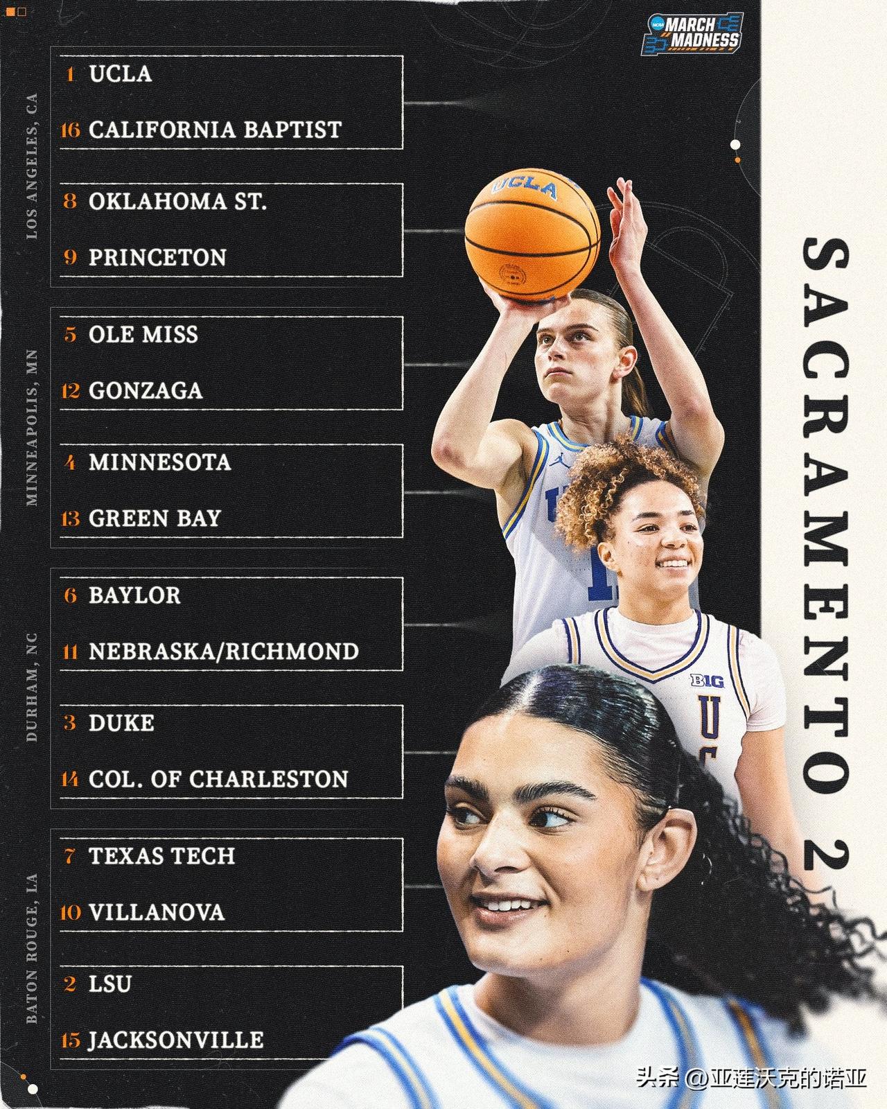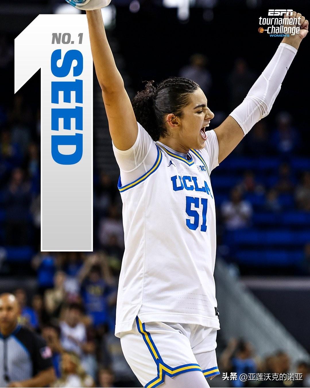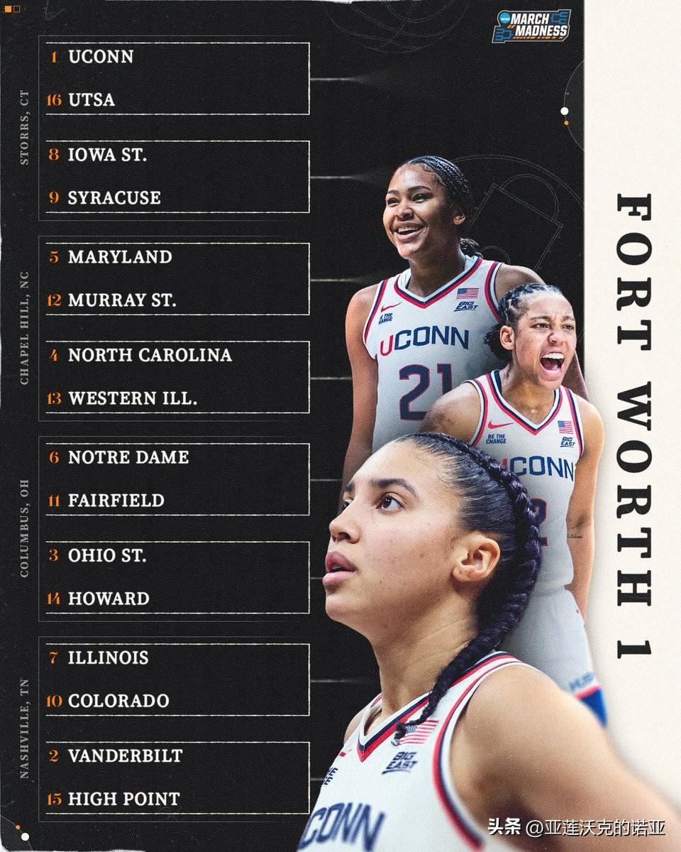 康涅狄格大学哈士奇队以全胜战绩拿到疯狂三月 头号种子,另外三个赛区1号种子是Big Ten联盟常规赛与锦标赛冠军UCLA、SEC联盟德州与南卡大学,中国后卫邓雨婷Yuting Deng所在的贝勒大学则排在萨克拉门托举办的Region 2赛区6号种子。