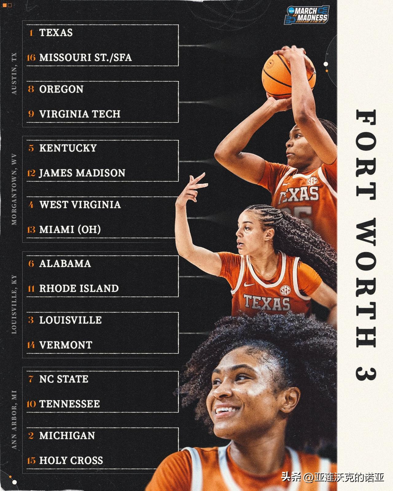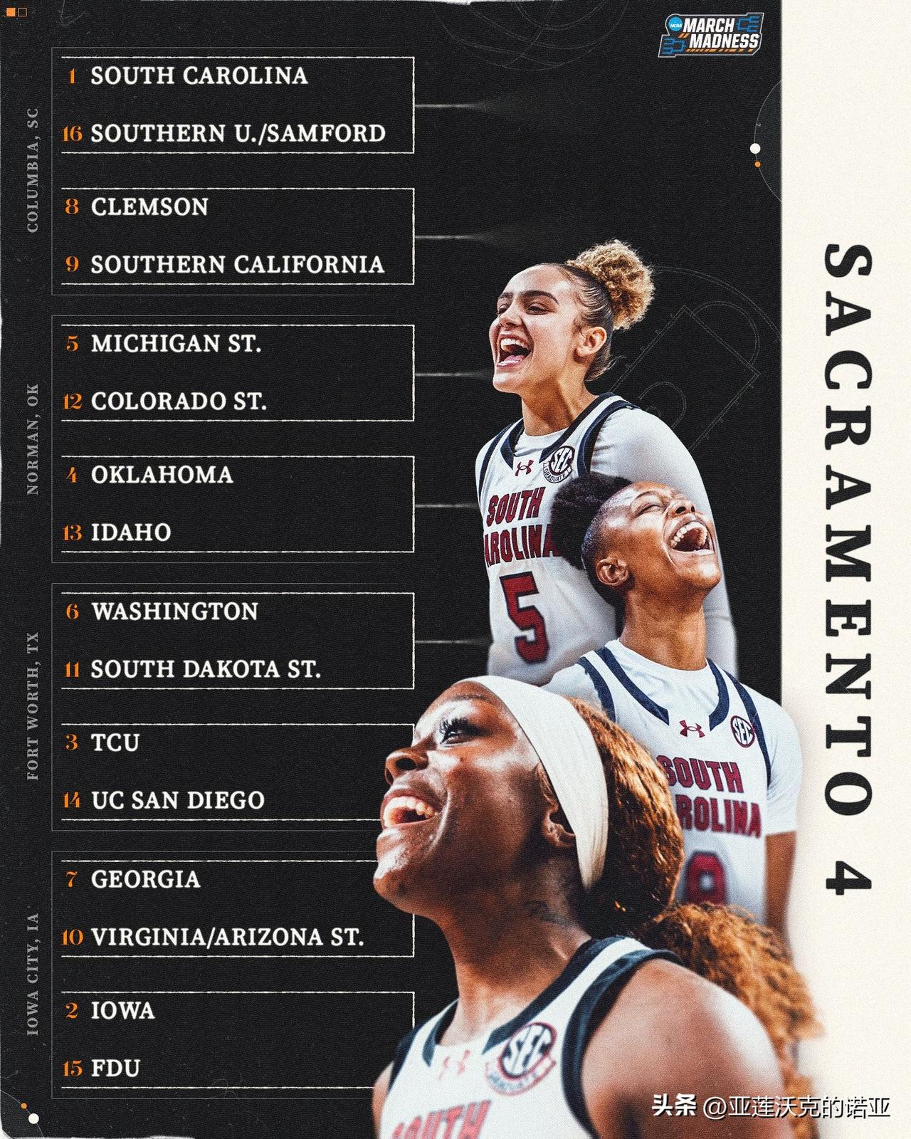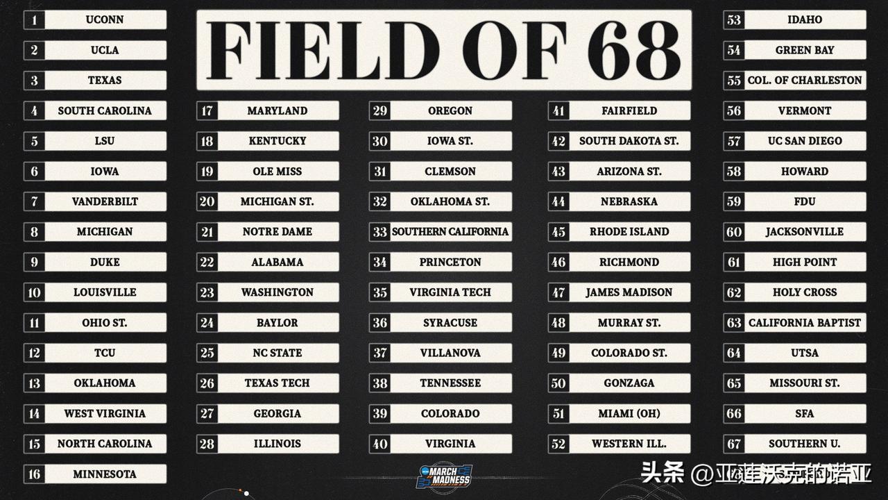 康涅狄格大学哈士奇队以全胜战绩拿到疯狂三月 头号种子,另外三个赛区1号种子是Big Ten联盟常规赛与锦标赛冠军UCLA、SEC联盟德州与南卡大学,中国后卫邓雨婷Yuting Deng所在的贝勒大学则排在萨克拉门托举办的Region 2赛区6号种子。