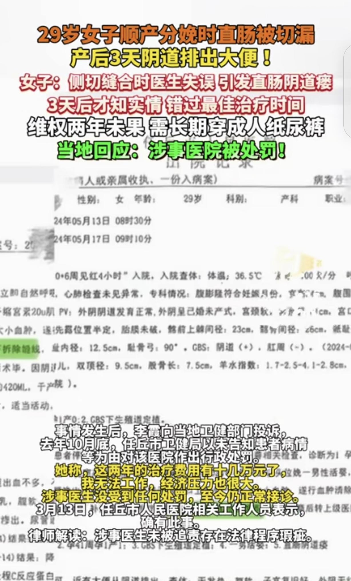 “把人坑惨了!”河北任丘,一29岁女子顺产生娃,医生给她侧切缝合时,一个失误,导致她直肠被切瘘,也没告诉她,3天后,她竟从阴道排出大便,医院一看瞒不住了,才说出实情,但女子转院后,已经错过最佳治疗时间,造成不可逆的伤害,经过1年的抗感染治疗,修复手术也失败了,需要一生都穿成人纸尿裤。她维护权益2年,花了10几万了,但医院却没被处罚,正常接诊。 就这样安安静静待了三天,意外突然发生了。她发现自己竟然从阴道排出了大便,瞬间懵了,家人也慌了神,赶紧喊来医生。这时候,医院才瞒不住了,吞吞吐吐说出实情——侧切缝合时,医生操作失误,不小心切到了她的直肠,形成了直肠阴道瘘,只是当时没敢说,想着能蒙混过关。 得知真相的一家人,又气又急,当即要求转院治疗。可谁也没想到,就是这三天的隐瞒,彻底错过了直肠阴道瘘的最佳治疗时间。要知道,这种病症最忌讳拖延,一旦发生损伤,及时处理就能最大程度降低伤害,可医院的刻意隐瞒,让损伤部位发生了重度感染,病情彻底恶化。 他们辗转来到天津的大医院,医生检查后直言,情况已经很不乐观,直肠下端有一个指尖大小的瘘口,因为感染严重,只能先进行抗感染治疗,再考虑修复手术。这一治疗,就是整整一年。 这一年里,她每天都要承受感染带来的痛苦,排泄完全不受控制,只能靠营养液维持身体,甚至因为长期无法正常休养,还患上了风湿病,整个人瘦得脱了形。 好不容易等到感染控制住,2025年,她接受了直肠阴道瘘修复手术,可所有人的期待,最终还是落了空——手术失败了。 医生告诉她,因为错过了最佳治疗时机,瘘口已经形成不可逆的损伤,这辈子都无法恢复正常,只能一直穿着成人纸尿裤生活。这句话,像一盆冷水,浇灭了她所有的希望。 从那以后,她的生活彻底陷入了困境。不能正常工作,不能出门社交,每天都要被漏便、感染困扰,心理和身体承受着双重折磨。为了治病和维权,她和家人前前后后花了十几万元,家里的积蓄被掏空,还欠了不少外债,原本平静的生活,被这场医疗失误彻底打乱。 更让人无法接受的是,她维权整整两年,跑遍了各个相关部门,可涉事医院不仅没有受到重罚,只是被当地卫健部门罚款5万元,涉事医生更是没有受到任何处分,依旧在医院正常接诊,仿佛这场毁了一个女人一生的失误,从来没有发生过。 有人可能会说,医疗行业有风险,失误难免。可失误不可怕,可怕的是失误后的隐瞒和逃避。如果当时医生缝合时发现失误,第一时间告知患者,及时采取补救措施,哪怕是立即转院,也不会造成今天这样不可逆的伤害。 更让人寒心的是,医院的病程记录里,明明记载着术中已经发现缝线穿透直肠黏膜,却依旧选择隐瞒,这种刻意的欺骗,比失误本身更伤人。 反观同样是医疗纠纷的案例,有的医院在出现失误后,主动承担责任,积极赔偿患者损失,追究相关医生责任,既挽回了患者的损失,也守住了医院的底线。 而任丘这家医院,不仅隐瞒失误,还在患者维权时推诿敷衍,涉事医生甚至拉黑家属联系方式,这种态度,不仅寒了患者的心,也践踏了医疗行业的公信力。 其实很多人不知道,直肠阴道瘘这种病症,早期治疗的治愈率能达到98%以上,可一旦拖延,不仅治疗难度翻倍,成功率也会大幅下降,甚至会造成终身损伤。医院的隐瞒,本质上就是剥夺了患者的救治权,把一个原本可以治愈的小问题,拖成了毁终身的大灾难。 这两年她通过12345、国家信访平台等多种渠道投诉,得到的回复却只是“不能一案两罚”,可医院和医生本就是两个不同的主体,医生的违规操作,凭什么不用承担任何责任? 按照相关法律规定,涉事医生至少存在未履行告知义务、隐匿医疗过失、违规操作等多项问题,理应受到警告、暂停执业甚至吊销执业证书的处罚,可直到现在,依旧无人追责。 这件事从来都不只是一个人的悲剧,更是对整个医疗行业的警示。医疗行业关乎生命健康,每一次操作都容不得半点马虎,每一次失误都可能酿成无法挽回的后果。 而失误后的担当,远比掩盖错误更重要。医院的责任,不仅是治病救人,更是在出现问题时,敢于直面错误、承担责任,守护患者的合法权益。 这个29岁的女子,还要带着终身的伤痛,继续她的维权之路。我们不禁要问,到底要多久,她才能得到一个公平公正的说法?涉事医生到底该承担怎样的责任? 医院的监管漏洞,又该如何弥补?希望这件事能引起相关部门的重视,严查医疗违规行为,还患者一个公道,也守住医疗行业的底线,不让更多人因为类似的失误,毁掉自己的一生。