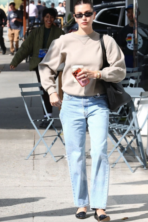 HaileyBieber被拍到在比弗利山庄出街买咖啡,一身极简穿搭又美又飒 • 上衣:浅卡其色圆领卫衣,宽松版型慵懒随性 • 下装:经典浅蓝直筒牛仔裤,复古又显腿直 • 鞋包:黑色尖头低跟鞋 + 大容量托特包,干练又实用 • 配饰:窄框墨镜 + 简约金表,细节处尽显高级感 整套 look 没有多余装饰,却把“毫不费力的时髦”拿捏得恰到好处,完全是教科书级别的 Off-Duty Style