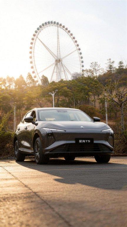 纯电出行实力派,风行星海 T5 来袭。120kW 电机动力平顺,2730mm 轴