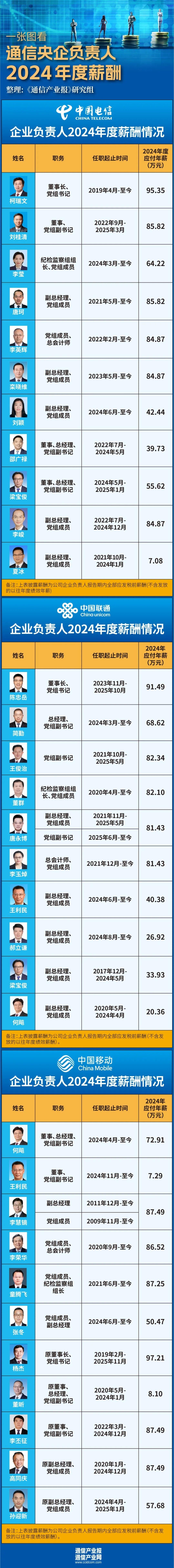 【广电高管薪酬曝光:明显低于三大运营商,平均不足60万】 日前,国家广播电视总局披露了2024年直属企业负责人薪酬情况,中国广播电视网络集团有限公司(下称“中国广电”)高管薪酬随之曝光。数据显示,中国广电党委书记、董事长宋起柱以63.78万元的应付年薪位居公司首位;总经理张文晨及其他多位副总经理的应付年薪均为57.40万元。整体计算,中国广电高管平均薪酬不足60万元。 这一水平明显低于国内三大电信运营商。根据各运营商公布的数据,2024年三大运营商主要负责人薪酬普遍在90万元以上。其中,中国移动原董事长杨杰以97.21万元居首,中国电信董事长柯瑞文为95.35万元,中国联通原董事长陈忠岳为91.49万元。三大运营商副总经理级别的平均薪酬也普遍超过80万元。部分高管因任职时间不满全年,薪酬相应减少。 值得注意的是,中国广电与三大运营商在管理体制上存在差异。后者属于国资委管理的中央企业,而中国广电为国家广电总局所属的中央文化企业。 尽管管理条线不同,但此次薪酬对比仍引发外界关注。从业绩看,2024年三大运营商虽然营收增速放缓,但净利润保持增长,数字化转型正成为新动能。