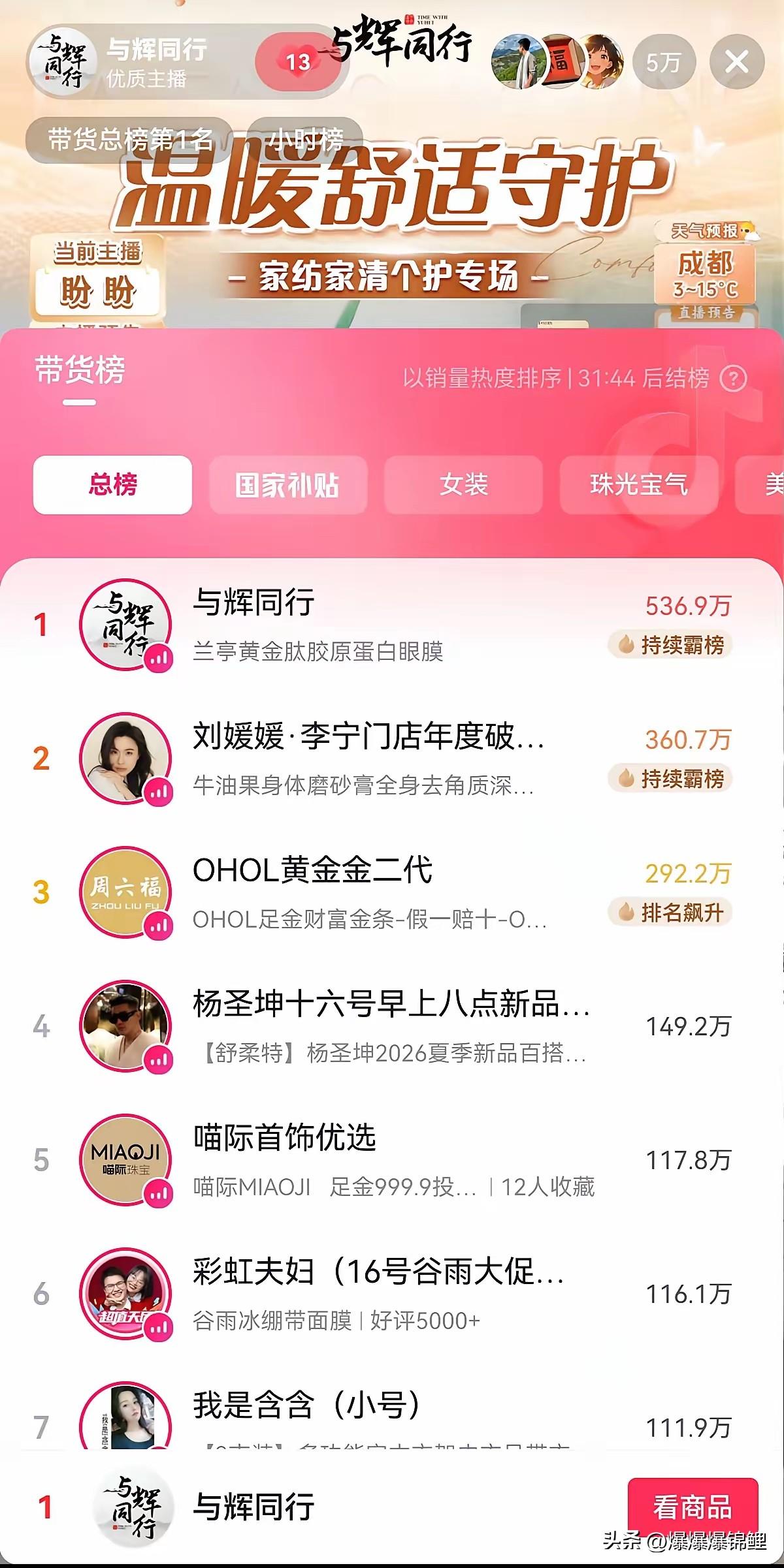 一大早刷到“与辉同行”最新公布的本周排班表。 从头看到尾,竟然没找着董宇辉的名字。 这下估计不少冲着他去的人,心里多少有点失落。 但细想想,这事其实透着别的信号。 我觉得,他大概率是腾出手去忙幕后的“大事情”了。 现在团队人气稳得很,一大早开播照样有一堆人涌进去捧场。 他确实没必要再像普通打工人那样,天天按时去台前刷脸。 有没有一种可能,以后在常规的排班表上,咱们根本就见不到这三个字了? 毕竟身份不一样了,普通人和老板考虑的东西肯定不一样。 以后估计最多也就是偶尔搞个“空降”给大伙送点惊喜。 顺便再让外界看看,他只要一露脸,在线人数瞬间破10万+的真实号召力。