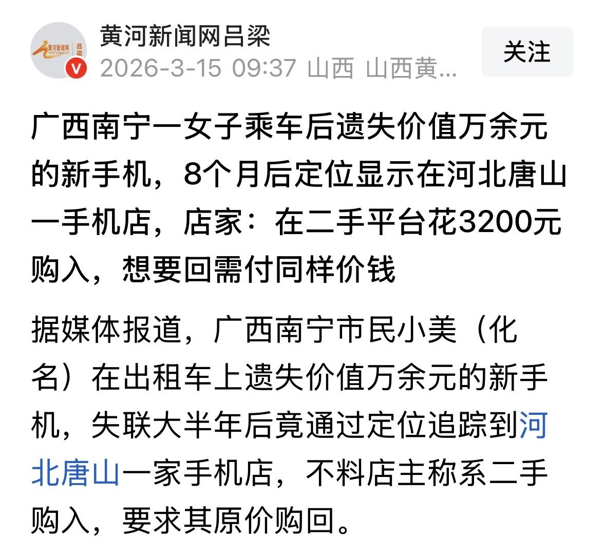 2025年广西南宁,女子不慎把上万元的新手机遗落在出租车上,司机却说“没看见”,8个月后,女子通过远程定位发现手机出现在重庆,又一路到了河北,最终出现在一家手机店里,她连忙来到店里,想要回手机,可老板却说,这是他在二手平台花3200买的,想拿回去就得付同样的价钱,女子这下头大了。 事情发生在2025年7月的一天,南宁的天气还带着盛夏的燥热,小美忙完一天的工作,拦了辆出租车往家赶,一路上累得昏昏沉沉,下车的时候只顾着拎手里的包,压根没注意到口袋里的手机已经滑了出去,落在了出租车的后座上。 这可不是普通的旧手机,是小美刚发完工资,咬牙花了一万两千多块买的新款智能手机,还没用到一个月,保护膜都没撕干净,里面不仅存着她和家人的照片、工作上的重要文件,还有绑定的银行卡、社交账号,一旦被别人捡到乱用,后果不堪设想。 小美慌得手都在抖,赶紧拨通了朋友的电话,让朋友帮忙登录自己的手机账号,启动了设备查找功能,同时开启丢失模式,锁定了手机屏幕,还设置了联系方式和留言,希望捡到的人能联系自己。 手机查找页面很快加载出来,一个绿色的小光点在屏幕上清晰显示,位置就在南宁市区,而且根据定位轨迹来看,刚好和她刚才乘坐的出租车路线完全重合,甚至能精准定位到出租车的大致位置。 小美悬着的心稍微放下了一点,她赶紧翻出手机支付记录,找到刚才打车的订单,拨通了出租车司机的电话,语气急切地说明情况,希望司机能帮忙看看后座有没有遗落的手机。 可电话那头的司机,语气却格外平淡,一口一个“没看见”“不知道”,还说自己送完美美之后,又接了好几个乘客,就算有手机,也可能是其他乘客捡走了,和自己没关系。 小美反复跟司机解释,定位明确显示手机还在他的车上,可司机要么敷衍应付,要么干脆说自己在开车,挂断了电话。 小美不甘心,又连续打了好几通电话,可司机要么不接,要么接了之后依旧否认,就在她准备联系出租车公司投诉的时候,手机查找页面突然变暗,绿色的光点消失了——很明显,对方把手机关机了,定位也随之中断。 之后的日子里,小美没有彻底放弃,每天闲下来就会打开手机查找页面,隔三差五刷新一次,哪怕知道希望渺茫,也抱着一丝侥幸。 她还联系了南宁当地的出租车公司,提交了打车订单和定位截图,希望能通过公司联系到司机,可对方反馈说,司机坚持否认捡到手机,没有任何证据能证明手机落在他车上,事情只能不了了之。 可谁也没想到,2026年2月的一天,小美像往常一样刷新查找页面时,沉寂了大半年的账号突然亮了,绿色的光点再次出现,只是这一次,位置已经不在南宁,而是远在千里之外的重庆。 小美一下子来了精神,赶紧持续关注定位轨迹,她发现手机在重庆停留了不到一周,就又开始移动,一路向北,经过湖北、河南,最终停在了河北省唐山市玉田县的一个小镇上,定位精准显示在一家手机维修兼二手手机销售的店里。 根据手机查找功能的特性,这种情况大概率是手机被人开机刷机,或者拿到店里准备出售,小美不敢耽搁,当天就买了从南宁到唐山的高铁票,连夜赶了过去。 第二天一早,小美按照定位找到了那家手机店,一进门就看到自己丢失的那部手机,正放在柜台里展示,机身的划痕和她丢失前的样子完全一致,她一眼就认了出来。 小美激动地跟店主说明情况,说这是自己八个月前丢失的手机,还拿出了手机的购买凭证、序列号,以及定位轨迹截图,证明手机的归属权。 可店主的话,却给小美泼了一盆冷水。店主说,这部手机是他不久前在二手交易平台上花3200块钱收购的,当时卖家说手机是自己闲置的,手续齐全,他也没多想就买了下来。 现在手机已经属于他的合法财产,小美要是想拿回去,就得付给他3200块钱,相当于把手机“买”回去,否则他不可能轻易归还。 小美一下子就懵了,自己的手机丢了,找回来还要再花一笔钱,任谁也接受不了。她跟店主反复协商,说自己可以拿出一部分补偿金,感谢店主帮忙保管手机。 但3200块钱实在太多,可店主态度坚决,说自己也是花了钱的,不能亏本,双方僵持了很久,也没能达成一致。 无奈之下,小美联系了当地的派出所,希望民警能帮忙协调,可民警表示,因为事情的事发地在南宁,当地并非案件事发地,无法立案,只能帮忙从中调解,目前双方还在进一步协商中。 其实很多人不知道,手机丢失后,除了开启丢失模式,还可以通过手机序列号联系品牌官方,锁定手机的使用权限,就算被人刷机,也无法正常激活使用,这也是小美能追踪到手机轨迹的关键。 而且根据二手手机交易的相关规定,收购二手手机时,商家有义务核实手机的来源,确认不是赃物、遗失物才能收购,否则可能需要承担相应的责任。