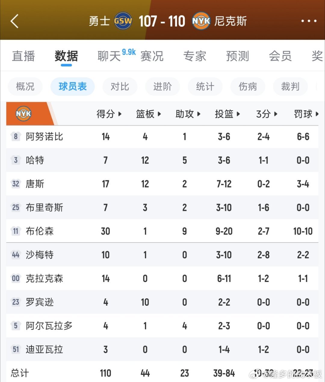 波杰姆斯基25分5板6助,布伦森30分9助勇士vs尼克斯