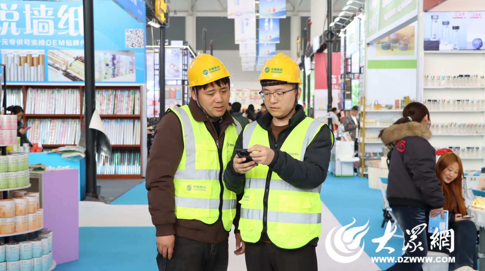 在熙攘的人群中,两位身着黄色马甲的工作人员格外醒目,他们是山东移动临沂分公司的通信保障人员,正专注地对展会现场通信网络运行状态进行实时测试与监测,为博览会全程筑牢通信保障防线。