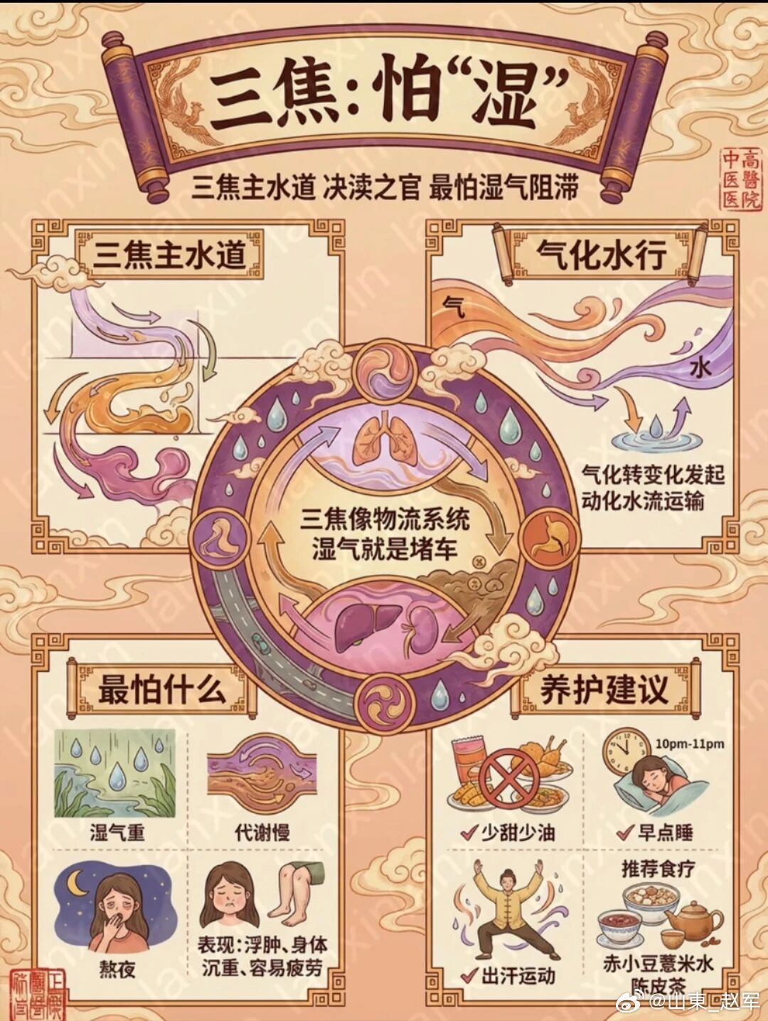 三焦是元气和水液运行的通道。它最怕气机郁滞。久坐不动、情绪压抑、缺乏运动,都会导致三焦不畅,水道不通,出现水肿、胀满、代谢紊乱。
