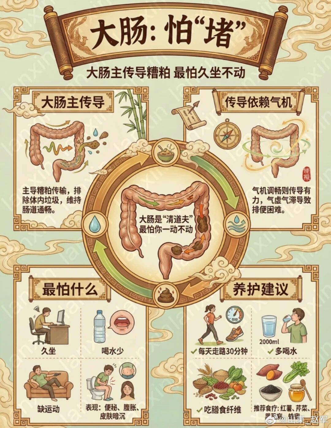 大肠主传导糟粕,排出大便。它最怕忍着不排。有了便意不及时上厕所,大肠会反复吸收粪便中的水分,导致大便干结。久而久之,形成习惯性便秘,毒素滞留体内。