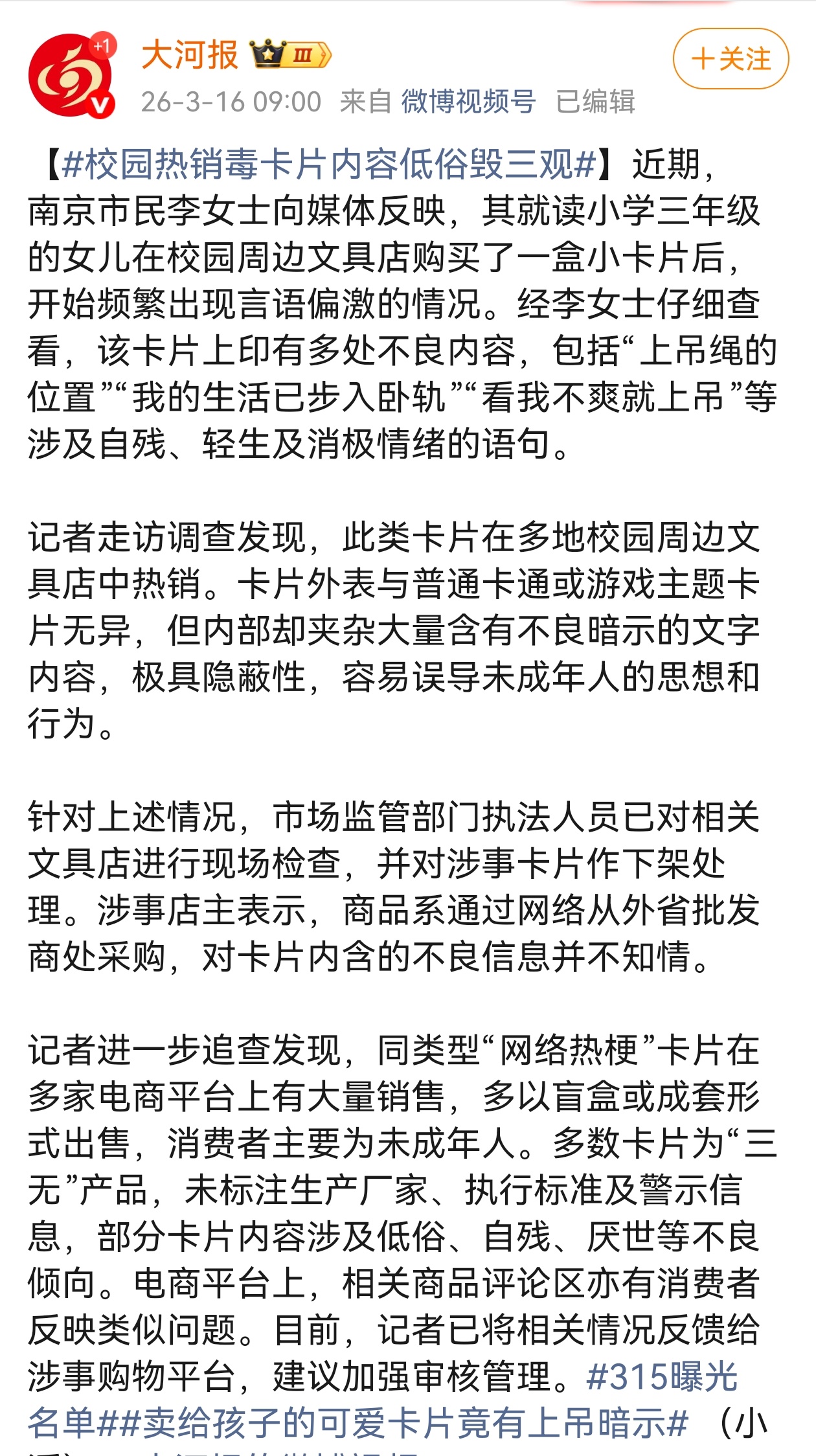 卖给孩子的可爱卡片竟有上吊暗示 这种内部夹杂大量含有不良暗示内容的卡片,极具隐蔽性,容易误导未成年人的思想和行为。