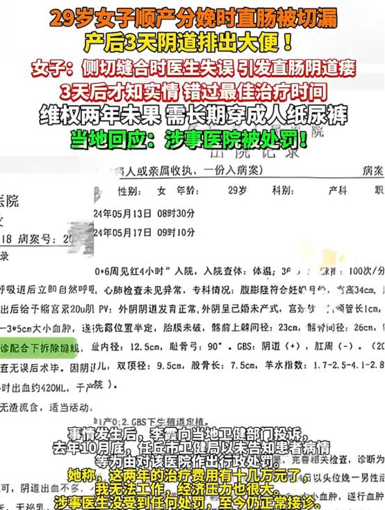 “太坑人了”河北任丘,29岁女子在某医院顺产生娃,3天后,突然在阴道里排出大便,女子吓坏了,赶紧找到医生询问情况,医生这才告诉她一个惊雷的真相,原来,在给她侧切缝合时,出现失误,直肠被切漏。女子来不及向医院追责,赶紧转院治疗,不曾想,错过最佳治疗时间,修复手术失败了,医生告知一生都穿成人纸尿裤。让她气愤的是,维权2年,涉事医院仍继续营业。网友:耽误人家一辈子,这怎么弄,践踏生命!   “你们到底对我做了什么!为什么大便会从阴道里排出?”2024年5月17日,刚生完孩子3天的李霞对着医生质问道。说出这句话时,她整个人都在发抖。   2024年5月14日,李霞躺在河北任丘医院的产床上,听到孩子的第一声啼哭,心里那块石头总算落了地。侧切缝合的时候医生动作挺快,她虽然疼得直冒冷汗,但想着顺产恢复快,忍忍就过去了。   缝合完成,医生告诉她孩子健康,还贴心的嘱咐她这几天吃流食、别吃硬的。当时李霞和丈夫都觉得是常规嘱咐,谁也没多想。   可产后这三天,李霞总觉得不对劲。肚子里老是有股坠胀感,想上厕所又上不出来,跟隔壁床的产妇聊起来,人家都说产后有点便秘正常。   然而到了第三天傍晚,那种憋不住的感觉越来越强烈,她让丈夫扶着去厕所,刚蹲下,一股东西就冲了出来。她低头一看,整个人都懵了:排泄物,竟然从阴道里流了出来!   她尖叫着喊丈夫,喊护士,整个产科病房都被惊动了。   直到这时候,医生才吞吞吐吐地告诉她真相:侧切缝合的时候,不小心把直肠给缝穿了,粪便才会从阴道里漏出来。至于为什么缝穿了三天才说,医生支支吾吾,最后只挤出一句“当时没注意”。   李霞顾不上追究,赶紧转院。从沧州跑到天津,跑了好几家医院,医生看了情况都摇头:拖了三天,伤口已经感染了,错过了最佳缝合时间,现在只能先抗感染,等炎症消了再看能不能做修复手术。   这一等就是一年多。那段时间李霞不敢吃东西,吃了就要漏,漏了就感染,感染了就得输液。她天天靠营养液吊着,瘦得皮包骨头。   最让她崩溃的,是那种感觉根本没办法控制。有时候坐着跟人说话,突然下面就湿了,她只能天天穿着成人纸尿裤,夏天闷出一身痱子,下面又疼又臭。   好不容易熬到2025年可以进行手术了,可结果以失败告终。医生告诉她,瘘口位置不好,加上长期感染,周围的组织都烂了,再修复的希望不大。她可能这辈子都得带着造口袋或者穿纸尿裤过日子。   李霞彻底崩溃了。她才三十出头,孩子还小,往后的日子怎么过?   更让她绝望的是维权之路。李霞翻出医院的病历,发现上面清清楚楚写着,手术时医生就发现缝线穿过了直肠,当场给拆了重缝。也就是说,医生一开始就知道出事了,但就是不说,只让她吃流食,想蒙混过关。等三天后症状出来了,瞒不住了,才告诉她。   两年来,李霞跑了无数趟卫健局,打过12345,在网上也投诉过。直到去年,任丘市卫健局总算给了个结果:医院被罚了5万块钱,理由是“未按规定书写病历”“未告知病情”。   至于那个医生,卫健局的答复是不能“一案两罚”,所以医生本人啥事没有,现在还正常上班接诊。   但这一处罚,如何对得起李霞受到的终身伤害?   如今,李霞仍在坚持维权,她希望的不只是赔偿,更是一个明确的交代:谁该为她的余生负责?谁来确保下一个产妇不再重蹈覆辙?医疗事故   信息来源: 浪涨新闻   文|墨海 编辑|史叔