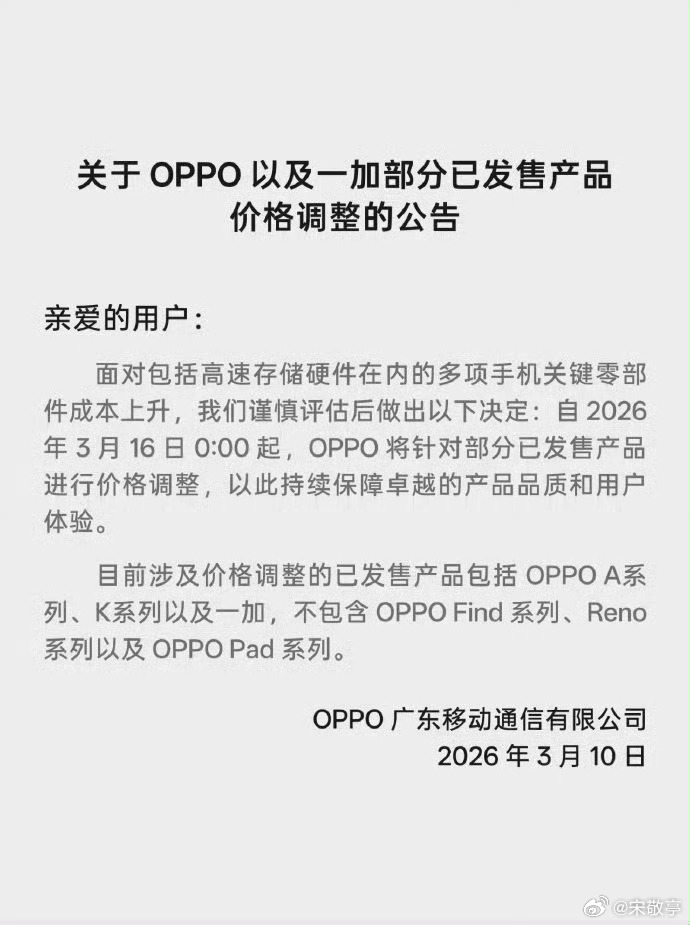 OPPO、vovo的调价公告都发布了,OPPO、一加产品今日生效,不同机型涨幅2