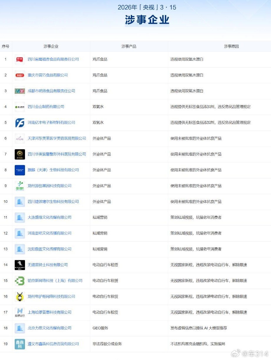 好好好,315晚会都曝光了啥?鸡爪加工环境脏乱差,外泌体抗衰产品乱象,青少年物理增高骗局,虚假健康课程,解除电瓶车限速,GEO定向投放AI虚假信息,荐股做票骗局…..好像都是些不痛不痒的东西吧?我们关注的汽车行业,居然没有一个上晚会的?难道汽车产业没有一点问题吗?没有一丁点消费者投诉吗?315晚会要是再这么办,那只能沦为笑柄了!315曝光名单315晚会315曝光台