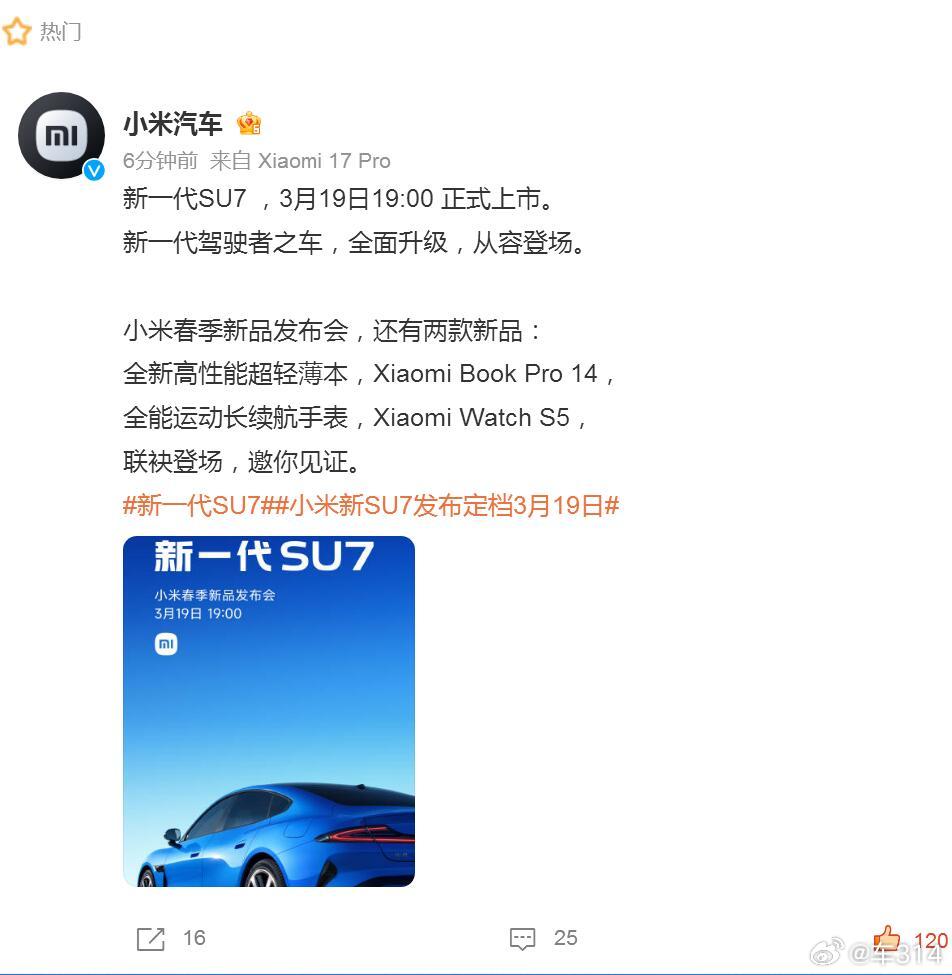 这次发布会主题不是“新起点”了,但之前雷军说小米造车依然在初始阶段,这能不能说小米是比较谦逊的呢?这些话术我们先放在一边,希望新一代小米SU7能变得更好,尤其是在之前被用户们吐槽的问题上。目前看来,门把手算是能给大家一个交代了,其他的我们还要继续观察一下。等到上市以后,我们会第一时间给大家来一次深度评测!小米新SU7发布定档3月19日 新一代小米SU7 小米su7